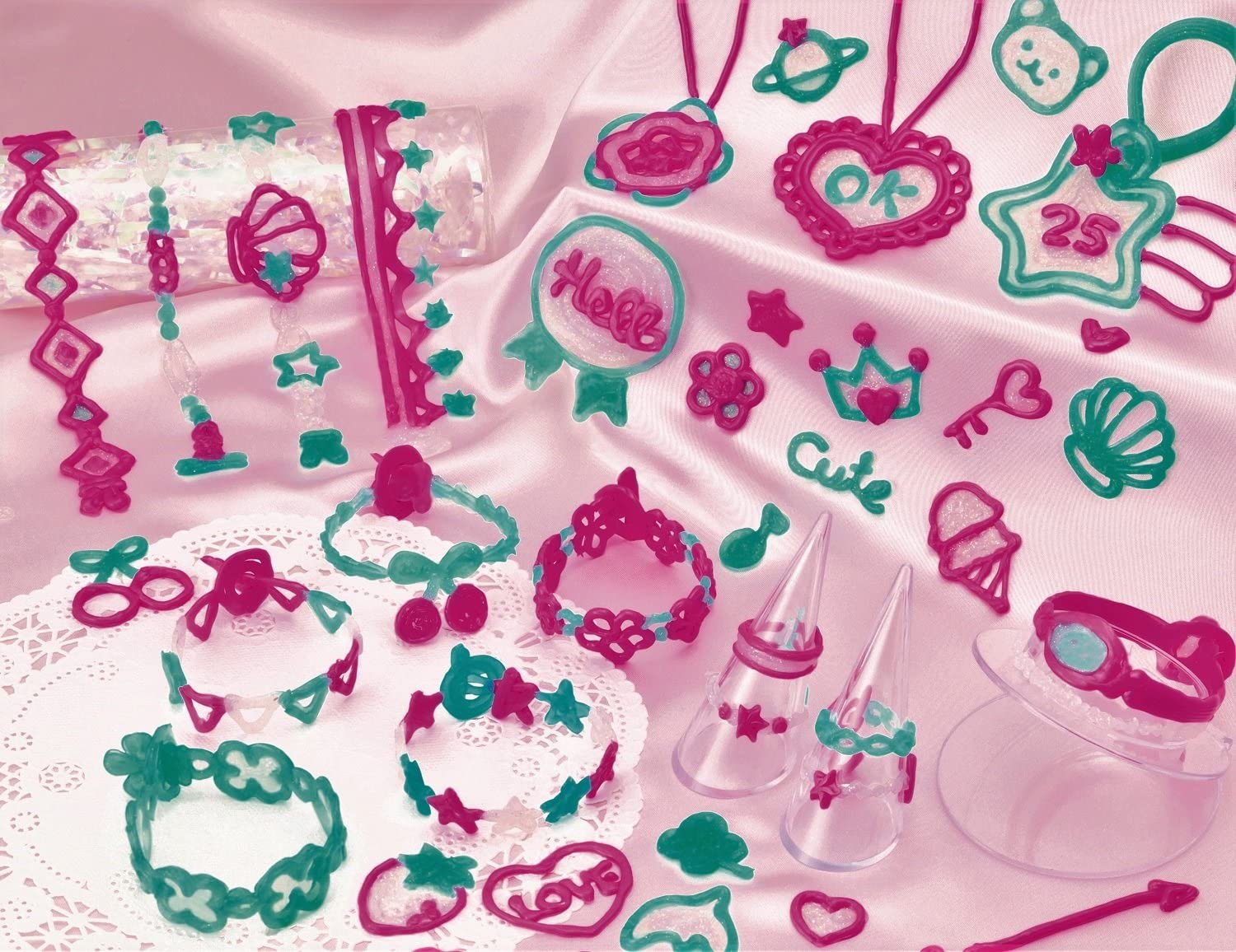 かいて!はがして!みにつけられる!新感覚のメイキングホビー商品。特殊(とくしゅ)なジェルのペンで、テンプレートをなぞると、その線がぷるぷる手触りのまま、はがせるようになるよ。ブレスレットやチャーム、シールなども作ることができるよ。もちろん、テンプレートを使わずに、オリジナルデザインも自由自在!世界に一つだけのジェル作品を作ろう!はじめてセットははじめてジェルアピールに挑戦する人にぴったり!ジェルペン3本付き!色は、パールピンク、ラメグリーン、ラメクリア。アイテムは60個以上作ることが可能。【セット内容】ジェルペン3本(ピンクパール、ラメグリーン、ラメクリア)、トレースシート1枚、デザインシート(両面)4枚、ノズル4個(.co.jpより)