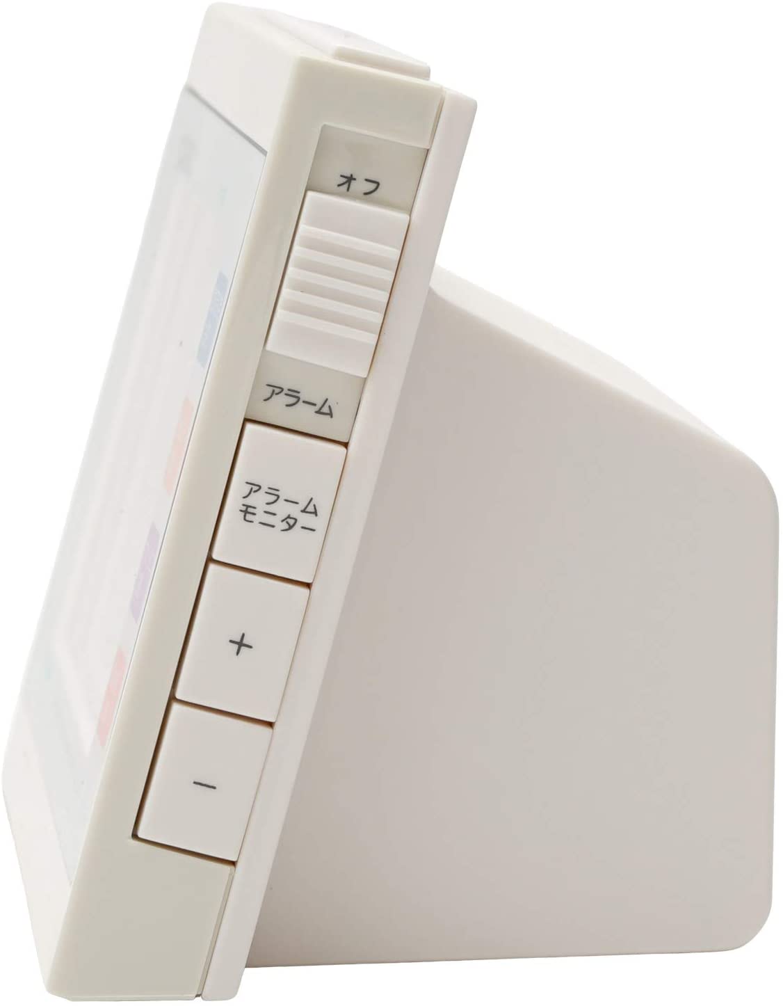 ●センサーにより計測された温度と湿度のバランスからお部屋の環境目安を表示してくれる機能が付いた、「日本気象協会」と共同企画されたデジタル表示の目覚まし時計●時刻合わせ不要の電波時計●環境目安の表示内容は「快適・風邪引き注意・乾燥肌注意・カビ・ダニ注意・熱中症注意」の5種類●時刻と同時に、カレンダーや温度・湿度を表示●電子音アラームや二度寝を予防するスヌーズ機能、暗闇でも時間を確認できるLEDバックライトなど目覚まし時計として十分な機能も備えています●本体側面にボタンがあり、画面を見ながらすべての操作が可能●底面に奥行きがあり、置いた時に安定します