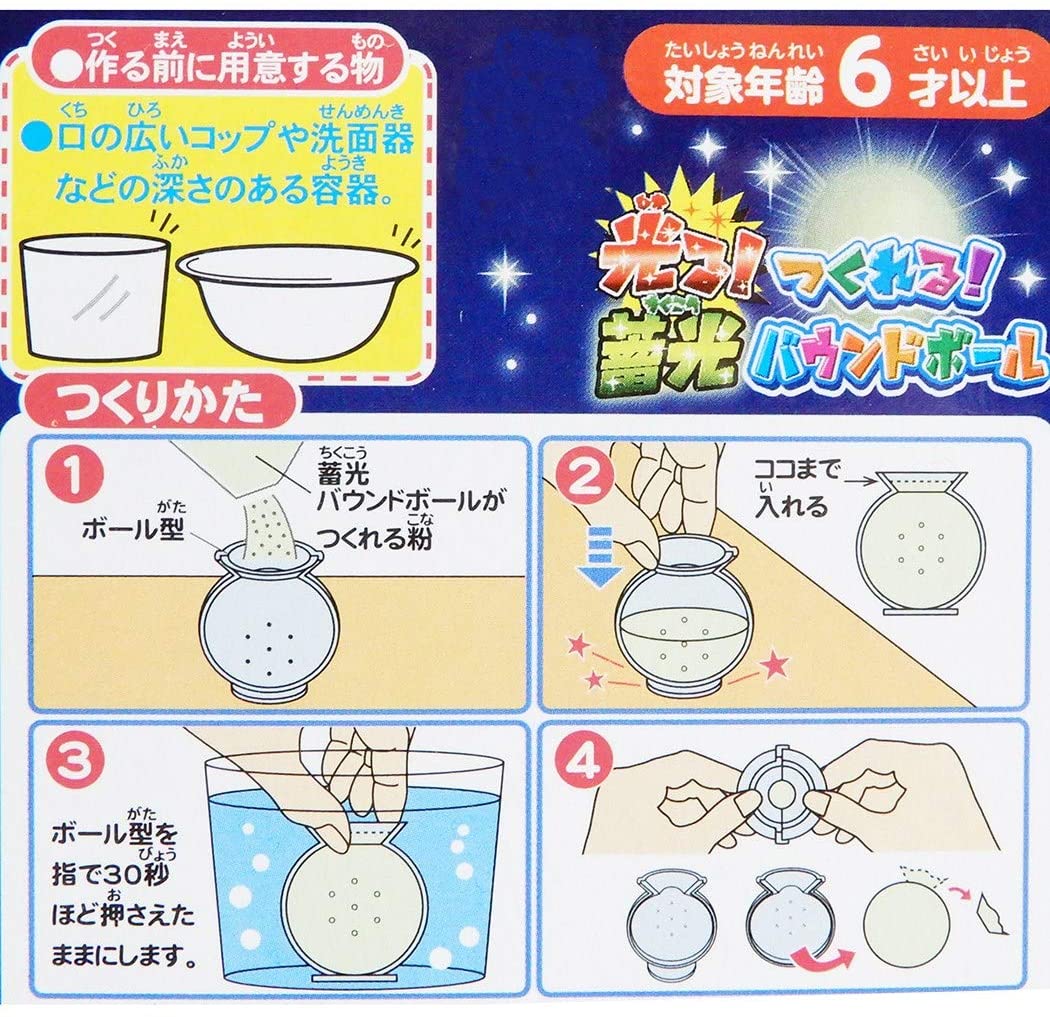 キッズたち大喜び 水に浸けるだけで簡単に光る蓄光バウンドボールが作れる製作キット蛍光灯や太陽の光を吸収して暗いところで光ります。パッケージサイズ:約80×160×45mmnセット内容蓄光バウンドボールが作れる粉/ボールの型/保管用ジップバック袋