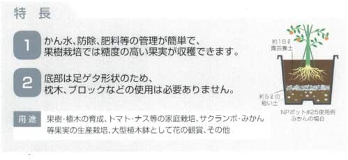 ・特長:かん水、防除、肥料等の管理が簡単で、果樹栽培では糖度の高い果実が収穫できます。底部は足ゲタ形状のため、枕木、ブロックなどの使用は必要ありません。