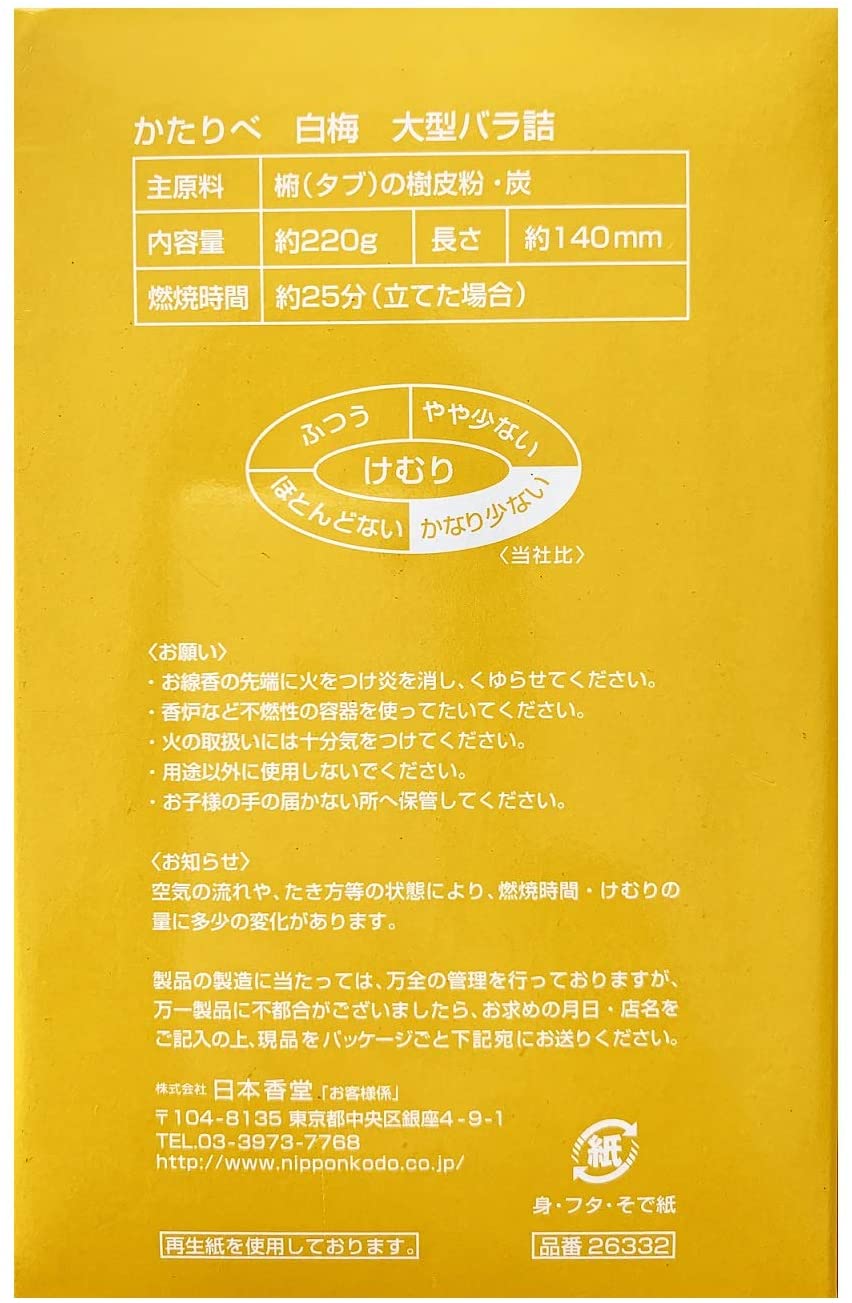 商品紹介自然の恵み、心やすらぐ芳香。けむりが少なく、残り香さわやか。よりお線香をお供えする意味合いお線香をお供えすることは、香煙を通じて仏様とお話しすることであると言われています。自分の身を清めたり、仏様の食事といった意味合いもあるようですが、なによりも、よい香りで心を落ち着けて仏様と向き合うことに大きな意味があるといえます。また、仏前での御焼香は仏・法・僧(仏…お釈迦さま、法…仏の教えを説いた教 典、僧…仏も教えを広めるお坊さん)への帰依を意味して3回行うといわれています。宗派によってちがいはありますが、お線香も仏・法・僧にならい3本立て るのが一般的だといえるでしょう。文化と技術、その継承と創造火と道具を手にした人類は文明を生み、そのときから香りの歴史が始まりました。貴重な火の持続のために焚き続けた炎の中から、あるとき偶然に立ちのぼった芳香。人はそれに神秘と力を感じ、人智を超えるものとして祈りや願いを託したのです。いま、世界の祈りの場では香が焚かれます。ときめきとやすらぎを求める場にも香があります。香は、現代の至高の精神文化であり、こころ豊かな暮らしの文化となっています。古代インドからたどって4,000年。東洋と西洋で独自の発展を遂げた香りの文化は、日本で再び出会い、融合し、新たな創造を加えて発展し続けています。そしていま世界は、日本で完成された香の文化を中心に、香りを共通語にして、ひとつに結ばれようとしています。日本の香りの歴史千数百年の時が育んできた日本の香り文化。日本の香りの歴史は、6世紀の仏教伝来を緒に形成されてきました。香木や香りのよい和漢植物等の香料を焚き、人々の祈りや願いをかぐわしい香りに託す。こうした宗教的儀式が広がる一方で、香を焚く習わしは貴人たちの優雅な生活文化のひとつとなり、室町時代には、焚いた香木を当てる香り遊びが発展して芸道となり、「香道」が生まれました。江戸時代に入ると、お香づくりの技術はさらに発達し、庶民の生活にも取り入れられていきます。現代にも使われているお香は、この長い「香」の歴史の中に位置づけられています。研究開発日本香堂の研究開発室では、調香や薬剤の専門家をはじめ多くの研究者たちが、これまでの蓄積データを応用しながら、くらしをさらに豊かにする香り商品の創造・開発に取り組んでいます。原料の厳選と安定確保香りは多種多様な香原料の調合によってつくられます。天然の貴重な香木や植物をはじめ、その粉体香原料、自然の花や草木などから抽出した香料、あるテーマに基づいて調香された香料……。それらは、産地やメーカーによって成分や特性がまったく違うため、香りの質に大きな影響を及ぼします。日本香堂では、世界中から集まるさまざまな原料を分析し、品質や安全性、さらに供給の安定性などを吟味して、優れたものを調達するよう努めています。また、調達ネットワークの新規開拓を進めるとともに、大規模な原料庫を設け、入手が困難になりつつある天然香原料を中心に大量の原料を保管。将来にわたって、香りの質や安定した価格を維持するための対策を戦略的に推進しています。