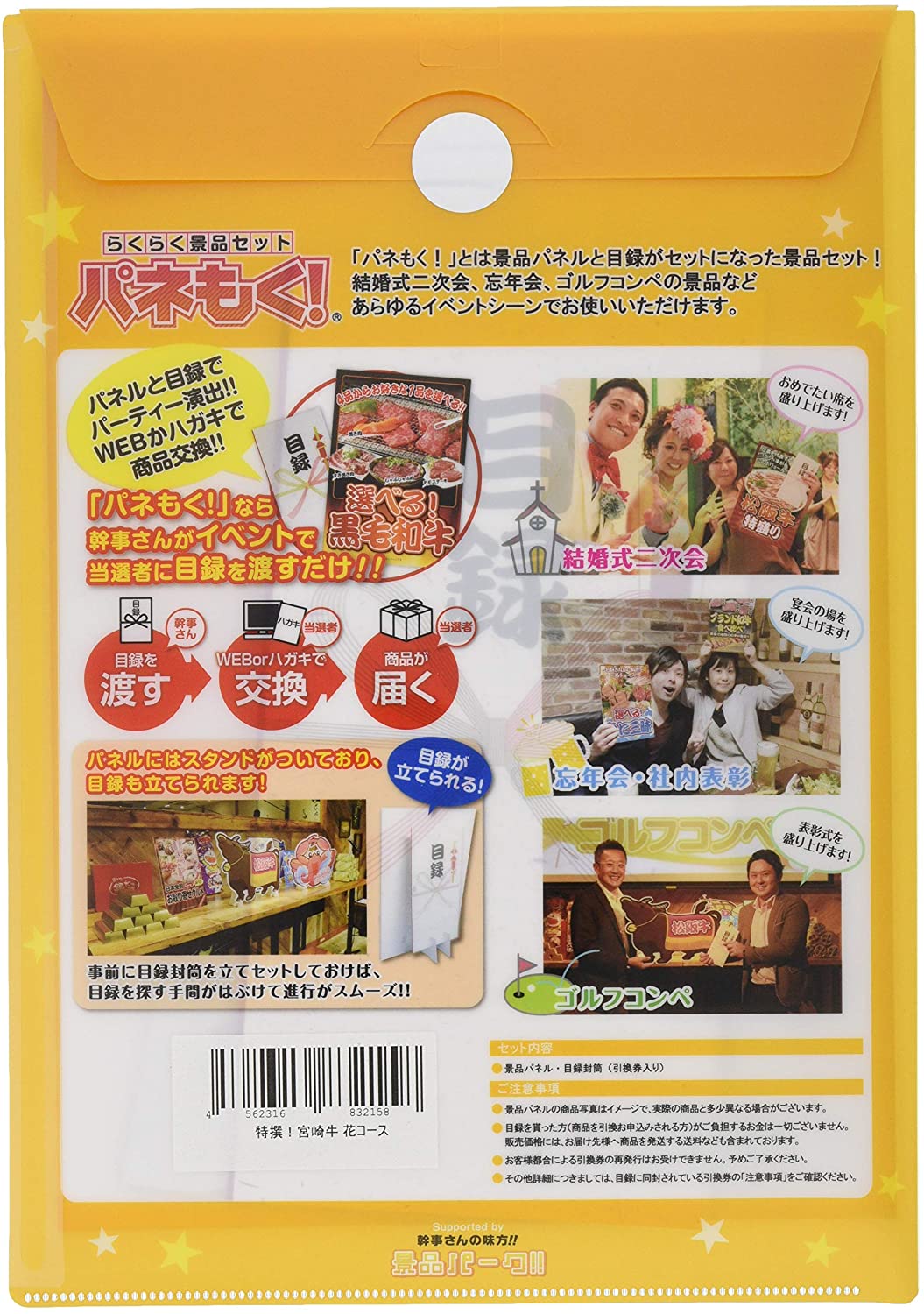 スタイル:特撰! 宮崎牛商品紹介結婚式の2次会、各種イベントやビンゴゲームを盛り上げるならパネル&目録付景品セットが最適です。目録を受け取った方に、後日、お申し込みハガキを投函していただき商品をお届けする目録景品です。イベント会場では荷物にならない目録を渡すだけなので、もらった人も幹事さんも大助かり! ■お届け目録景品セット内容・目録(引換券)・A4パネル■交換商品内容※目録を受け取られた方には下記商品より一つをお選びいただき、引換券(申込みハガキ)にてお申込み後、商品をお届けいたします。・宮崎牛 すき焼き【内容量】:300g・宮崎牛 しゃぶしゃぶ【内容量】:300g・宮崎牛 焼き肉【内容量】:300g※予告なく商品内容が変更となる場合があります。ご了承ください。■目録景品ご利用の流れ1ご注文者様へパネルと引換券(申込みハガキ)をお送りいたします。2イベント等にて目録を受け取った方が、引換券(申込みハガキ)に必要事項をご記入頂き、ポストへ投函していただきます。3ポスト投函後、約10日~2週間で商品をお届けいたします。より「パネル付目録景品」でイベントが盛り上がる!結婚式二次会、忘年会、新年会など各種イベントのビンゴゲームの景品、ゴルフコンペの景品としてパネル付目録景品をお使い下さい。コンパクトなのでかさ張らず、渡す人はもちろん貰う人も持ち帰りやすいので、喜ばれること間違いなし!■パネル付目録景品ってなぁに?「パネル付目録景品セット」とはパネル(A4もしくはA3サイズ)、目録(引換券)がセットになった商品。■ご注文から商品受け取りまで1,ご希望の商品をご購入いただきますと、ご注文者様へ目録とパネルをお送り致します。2,結婚式二次会、ゴルフコンペなどで当選された方(先様)へ目録をお渡しください。3,先様が同封の申込みハガキに必要事項をご記入いただきポストへ投函してください。4,お申込みから2週間ほどで商品が到着いたします。※目録ハガキの引換期限は在庫状況により異なりますが、最低でも2か月以上お付けしております。※商品によっては、ハガキでの引換方法とは異なる場合がございます、詳細は目録内の同封物をご確認ください。■パネル付目録景品セットの使い方 その1オススメ演出方法その1:「あらかじめ景品パネルを並べて豪華に演出!」1,クリアケースからパネルと目録を取り出しパネル裏面の脚を組み立て、パーティーの前にテーブル等に並べて準備完了。2,パーティーに訪れる参加者がつねにパネルを眺めることになり、ゲームや表彰式までの期待感を高める演出に!3,景品を受取る方には、目録裏面に記載されているパネルと同じ商品名の目録をお渡しください。■パネル付目録景品セットの使い方 その2オススメ演出方法その2:「一枚一枚景品パネルを紹介するサプライズ演出」1,「パネル」と「目録」がクリアケースに入った状態で参加者にはパネルの内容を見せないように隠す。2,パネルを小出しでご紹介。パネルで景品が紹介されるごとに、参加者は注目するので、飽きのこない演出になること間違いなし!3,景品を受取る方には、パネルと目録がクリアケースに入ったままお渡しください。