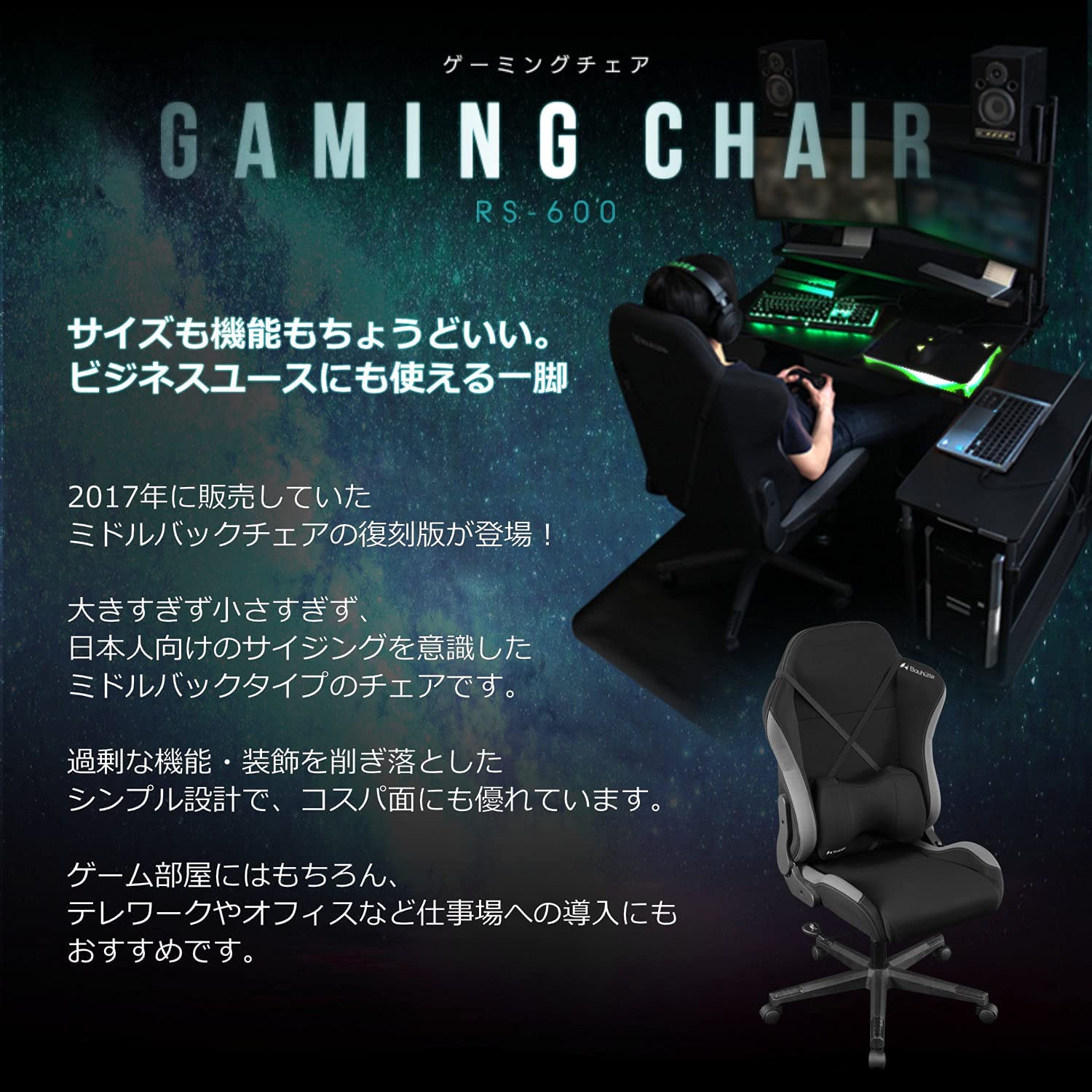 ◆ゲーミングチェア RS-600『サイズも機能もちょうどいい。 ビジネスユースにも適した一脚』2017年に販売していたミドルバックチェアの復刻版が登場。 大きすぎず小さすぎず、日本人向けのサイジングを意識したミドルバックタイプのチェアです。過剰な機能・装飾を削ぎ落としたシンプル設計で、コスパ面にも優れています。ゲーム部屋にはもちろん、テレワークやオフィスなど仕事場への導入にも適している。◆ ゲーム姿勢をサポートする立体クッションゲーミングチェアの特徴である、人体の構造に合わせた立体クッションを採用。腰にしっかりフィットするランバーサポートも付属し、正しい座り姿勢をサポートします。◆コンパクトなミドルバック当社ハイバックチェアと比べて約15cm背もたれを低くしたコンパクト設計。狭いスペースでもリクライニングが倒しやすく、使い勝手の良いサイジングです。◆ 日本人向け低座面設計座面高:38~45.5cm(対象身長150~181cm)。日本人用に調整を重ねた超低座面ゲーミングチェアです。※座面クッションの沈み込み:約1cmを考慮して試算しています。◆ リクライニング簡単なレバー操作で背もたれの角度を調節でき、最大135度までリクライニングします。◆ ロッキング体重の掛け方に合わせてシートが傾く、ロッキング機能を搭載しています。後傾姿勢でゆったりゲームをプレイしたい時に適しています。◆ ファブリック通気性に優れたポリエステルのファブリックを採用しています。さらっとした肌触りで蒸れにくく、快適な座り心地です。◆ キャスターチェアの移動性を重視し、ロック機能を排除しました。◆ シンプルなデザインゲーミングチェアにありがちな派手なデザインを見直し、部屋のインテリアやオフィスの雰囲気と馴染みやすいシンプルな配色に仕上げました。◆ アームレストが後付けできる座部裏には、別売りのアームレストが取り付けられるネジ穴を配備。好みに応じて肘掛けを追加できます。◆ゲーミングチェアシリーズ◯G-130テレワークに適合な、仕事環境にマッチするメッシュタイプのゲーミングチェアです。長時間座っていてもお尻が痛くなりにくいクッション性を確保しつつ、コンパクト&シンプルな一脚に仕上げました。◯G-350「まるでソファ」な、ポケットコイル内蔵ゲーミングチェアです。ふかふかの座り心地はもちろん、部屋の雰囲気に馴染みやすいインテリア性の高いデザインにもこだわりました。