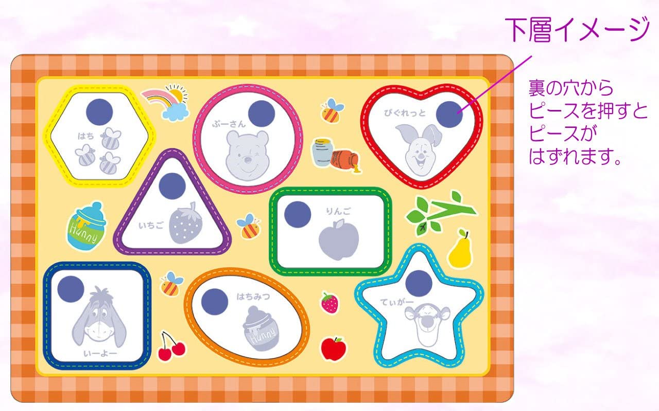 笑顔を育むベビーパズルです。お子様が初めて出会うパズルとして最適! 【ベビーパズルの特徴】初めてでも、遊びやすく、完成させやすいパズルです。●小さいお子様が遊びやすい、シンプルで楽しい絵柄! ●ピースの大きさと形が小さなお子様でも持ちやすい! ●ピースと同じ色が穴の周囲に残るので、パズルのヒントになって、完成させやすい! ●ピースをはずすと、下にもキャラクターが描かれていて、パズルのヒントに! ●特徴の多い形から少ない形まで、難易度にバリエーションがあって楽しい! ※対象年齢:1~2さい(.co.jpより)