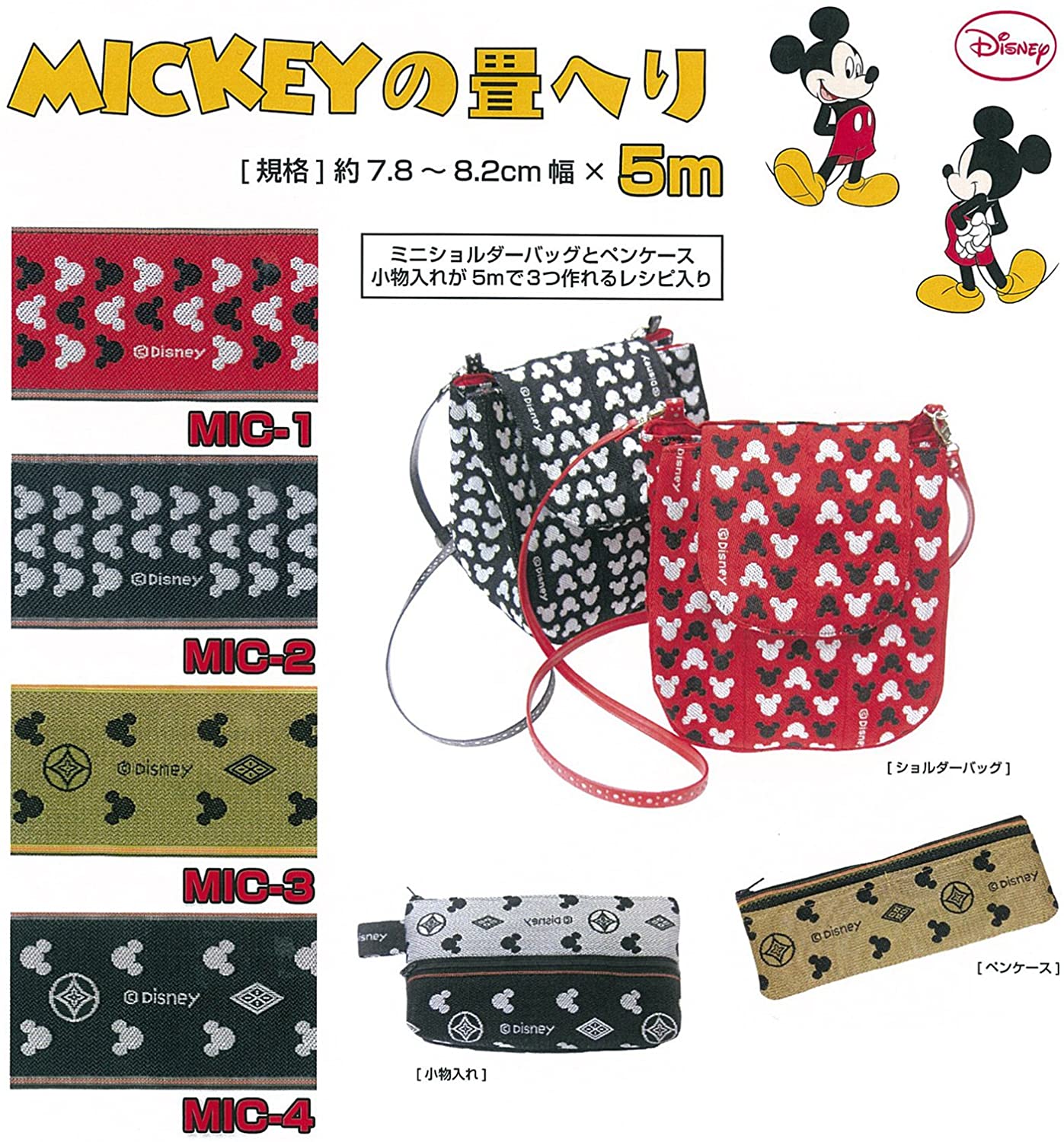 今話題の畳へり、軽くて丈夫、しかもとっても簡単に畳へりバッグが作れます。清涼感のある素材から光沢のある素材まで、豊富に品揃えしています。軽くて丈夫な畳へり。本品は畳へりの特性をそのまま楽しんでいただくために商品化されています。後加工は一切されておりませんので、高熱・水分・日光等により収縮・色落ち・色焼け・色移りすることがあります。畳のへりは外表に巻いております。裏面も使用できます。指で簡単に折り目を付ける事が出来ます。・人気者のミッキーモチーフ。・素材:綿55%・ポリエチレン45%・サイズ:約7.8~8.2cm幅×5m巻・ミニショルダーバッグとペンケース小物入れが5mで3つ作れるレシピ入り・?Disney(.co.jpより)