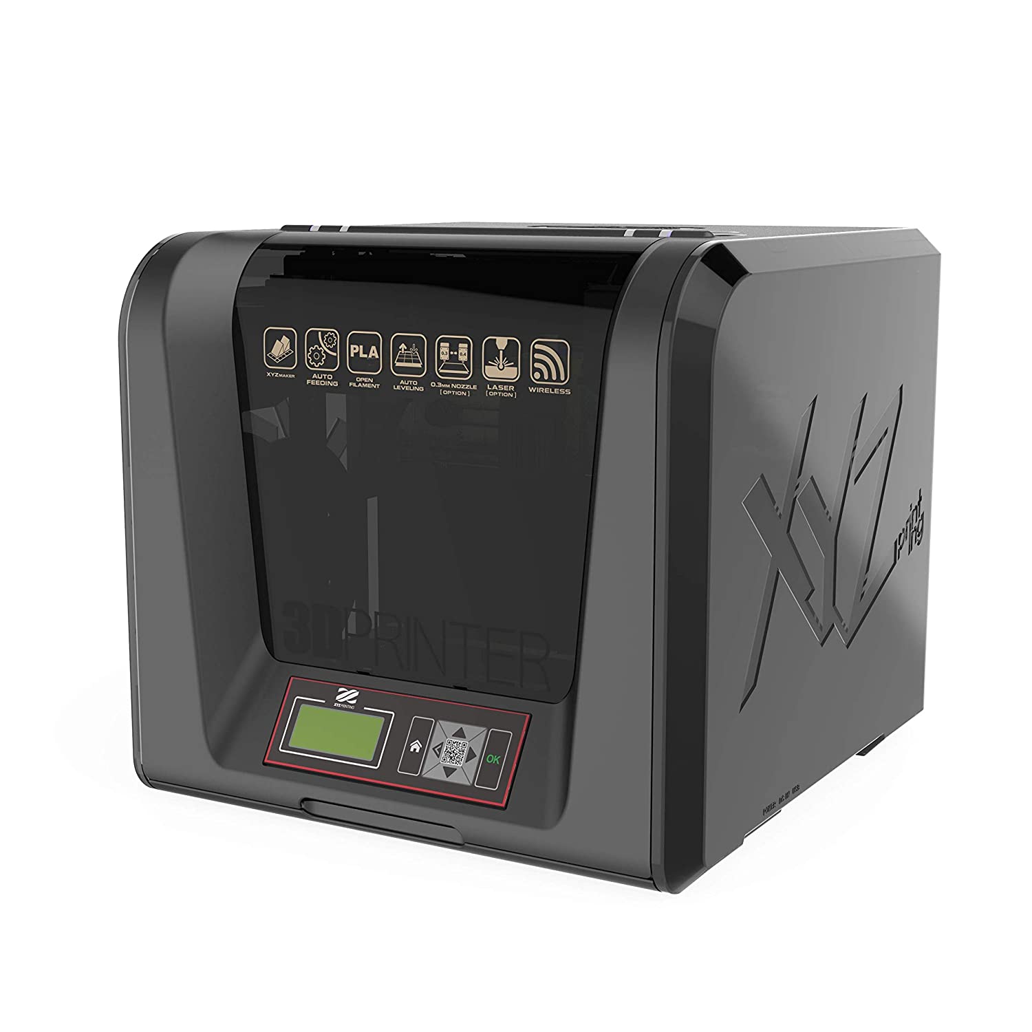 スタイル:単品●家庭用3Dプリンター日本国内トップシェア! XYZプリンティングの新作モデルです。組み立て済みの完成品なので、面倒な組立不要で箱を開けたらすぐにセットアップして使えます。ハイスペックながらお求めやすい価格を実現した最新モデルのコンパクト3Dプリンターで、企業だけでなく学校や個人にもおすすめの一台です。 ●オープンフィラメント対応で他社製フィラメントも使用可。高耐久のステンレス製エクストルーダーを標準装備。別売りオプションの高硬度エクストルーダーを装着すればメタリックPLA、カーボンPLAフィラメントも使えます。様々なフィラメントに対応することで3Dプリントの楽しさを広げます。 ●自動キャリブレーション(オートキャリブレーション)機能付きで、簡単に水平調整ができます。ボタン一つで機械が水平調整をしてくれるので本当に簡単にキャリブレーションが調整できます。 ●簡単操作で使いやすいソフトウェア(XYZmaker)はWEBから誰でも無料でダウンロードできます。モニターを見ながら簡単に印刷準備・設定→印刷ができます。 ●積層ピッチは0.02~0.4mmで高精度かつ緻密な印刷が可能。最大造形サイズは150×150×150mmで、コンパクトボディながら大きな印刷範囲になっています。印刷精度が非常に高い3Dプリントを実現します。 ●別売りオプションのレーザーモジュール装着でレーザー刻印機能を拡張可。紙、厚紙、革、木材に画像をレーザー刻印できます。 ◆印刷技術・・・FFF(熱溶解樹脂積層方式) ◆最大造形サイズ(幅×奥行×高)・・・150×150×150mm ◆積層ピッチ・・・0.02~0.4mm ◆XY位置の精度・・・0.0125 mm ◆Z位置の精度・・・0.0004 mm ◆本体サイズ(幅×奥行×高さ)・・・420 ×430 ×380 mm(パッケージサイズ505×588×475 mm) ◆本体重量・・・12kg(パッケージ重量15kg) ◆本体素材・・・外面プラスチック ◆ソフトウェア・・・XYZmaker Suite◆3D Buillderの対応・・可 ◆対応ファイル形式・・・.stl、 XYZ 形式 (.3w.、.nkg)、 G-code、 .3mf, .obj ◆ノズル直径・・・0.4mm(0.3mm※オプション可) ◆ノズル素材・・・高耐久ステンレス(オプションで高硬度エクストルーダーあり) ◆エクストルーダーノズル数・・・1 ◆ノズル最大加熱可能温度・・・最高 240 °C ◆最大印刷速度・・・160 mm/s ◆フィーダー数・・・1 ◆プリントプラットフォーム・・・非脱着式プラットフォーム (ガラス) ◆プリントプラットフォーム温度・・・加熱なし ◆キャリブレーション機能・・・自動校正(オートキャリブレーション) ◆内部照明・・・あり ◆使用可能材料・・・タフPLA、PLA、PETG、※メタリックPLA、※カーボンPLA(※高硬度エクストルーダー使用時のみ) ◆オープンフィラメント(サードパーティー材料対応)・・・可 ◆フィラメント・・・直径1.75mm ◆フィラメント自動供給機能・・・あり ◆ステッピングモーター・・・1/16マイクロステッピングの1.8°ステップ角 ◆モニターサイズ/メニュー言語・・・2.6インチ/日本語、多言語 ◆接続方法・・・SDカード(最大対応容量16GB)、 USB 2.0ケーブル、 Wi-Fi 802.11 b/g/n◆Wifi接続・・・可 ◆レーザー刻印機能・・・オプションで可 ◆レーザーモジュール価格・・・21,180円(税抜) ◆レーザー刻印範囲・・・15×15×15cm ◆レーザー刻印対応フォーマット・・・JPG / PNG / GIF / BM ◆レーザー刻印材質・・・紙、厚紙、革、木材 ◆電源/消費電力・・・100V~240V 12V/60W ◆作業温度・・・15~32 °C ◆作業湿度・・・30~60 % RH ◆保管温度(フィラメント)・・・10~40 °C ◆要求オペレーティングシステム・・・Windows 8、 8.1、 10 (64 ビット) /MAC OS X 10.10、10.11、10.12、10.13 ◆ハードウェア最小要件・・・PC バージョン: CPU 第4世代 Intel Core i5 プロセッサー 以上 / RAM:8GB / ハードドライブ空き容量: 20GB 以上 Mac バージョン:RAM: 8GB / ハードドライブ空き容量:20GB 以上 ◆無料保証期間・・・本体1年間・電動部3ヶ月・消耗品対象外 ・ガイドチューブ ・注入口クリーニングワイヤー ・クリーニングワイヤー5本 ・USBケーブル ・プラットフォームテープ2枚 ・ギアブラシ ・スクレーパー ・SDカード ・ACアダプター ・電源ケーブル ・付属フィラメント(カラーランダム・300グラム)※リール付き ・予備用継手(フィーダー部品)