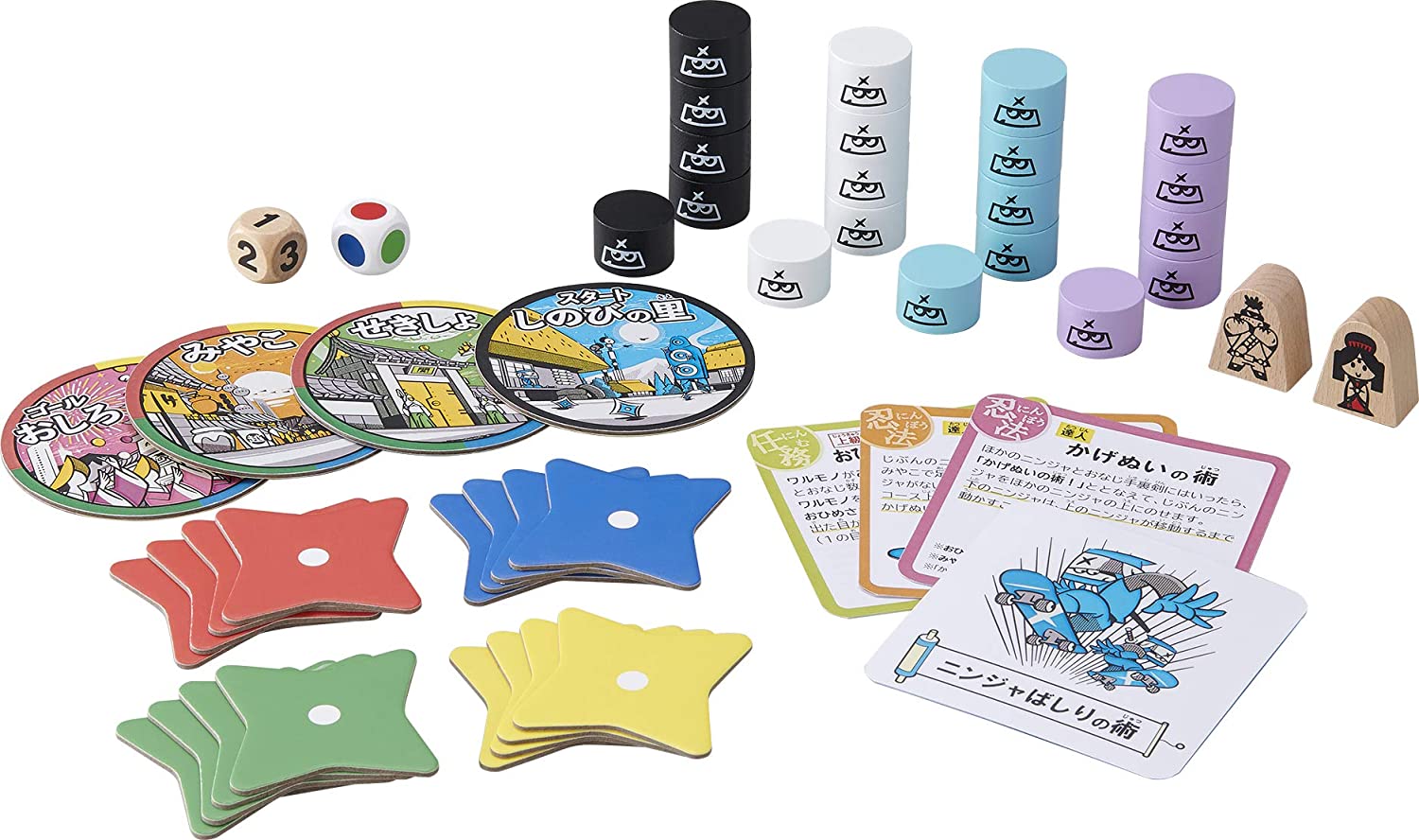 商品紹介サイコロを振ってコマを進め、誰が一番にゴールできるかを競う、すごろくをベースとしたボードゲームです。プレイヤーは修行中の見習いニンジャとなって、スタートであるしのびの里からゴールとなるお城まで、誰が一番にたどり着くかを競います。忍法を使えるようになったら一人前!一気にコマを進めたり、おひめさまをお助けする任務をこなしたりしながら、運と戦術を使って、ライバルよりも早くお城にたどり着きましょう。ご家族やお友達と一緒に、幅広い年齢層で初級、中級、上級、さらに達人と難易度を変えて何度でも楽しめます。安全警告小さな部品が含まれております。保護者のもとで遊ばせてください。