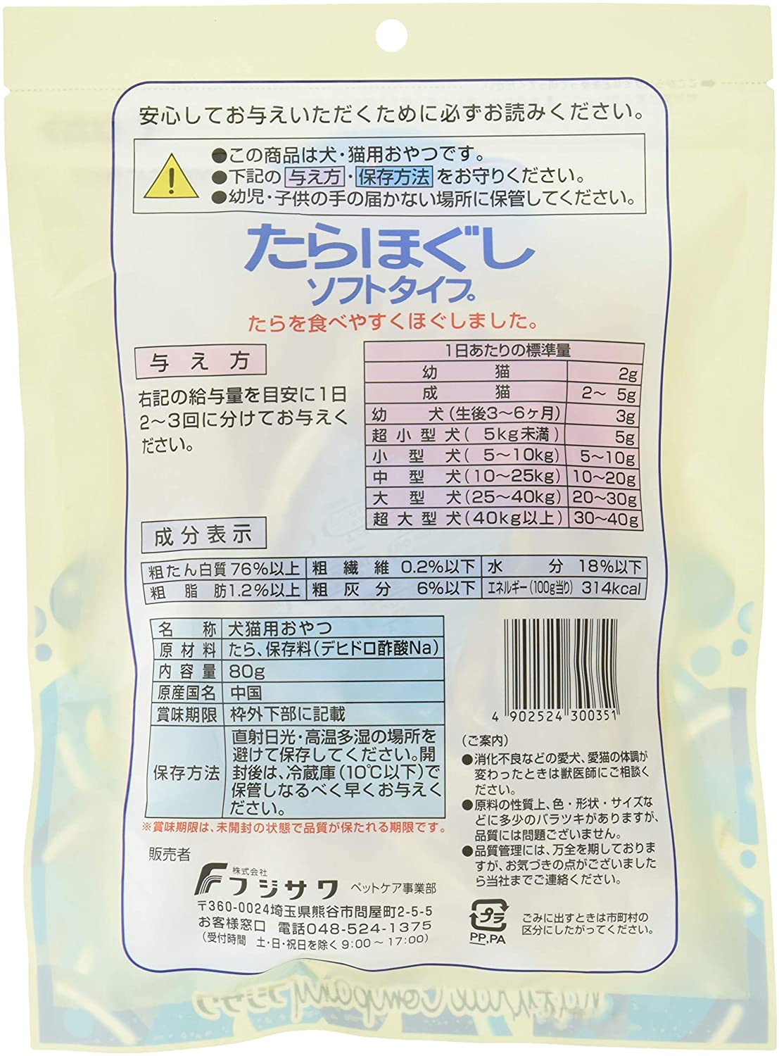 商品紹介たらを食べやすくほぐしました。80g入り。原材料・成分たら、保存料(デヒドロ酢酸Na)