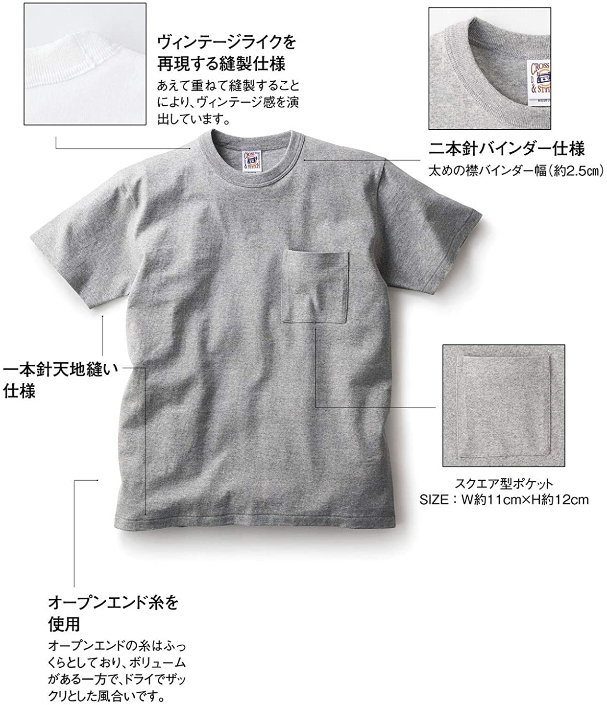 バインダーネックTシャツに、洗うと風合いが増すスクエアポケットをON。ヴィンテージライクを再現する縫製仕様 | あえて重ねて縫製することにより、ヴィンテージ感を演出しています。二本針バインダー仕様 | 太めの襟バインダー幅(約2.5cm)一本針天地縫い仕様 オープンエンド糸を使用 | オープンエンドの糸はふっくらとしており、ボリュームがある一方で、ドライでザックリとした風合いです。ブランド説明◆CROSS&STITCH(クロスアンドステッチ)◆毎日着られる、着倒せるタフなアイテムを中心に展開している無地のアパレルブランドです。着るほどに馴染む、トレンドに左右されないオーセンティックなアイテムを展開しています。オープンエンド糸を使用したアイテムをはじめとして,アメリカンカジュアルのテイストを好む人に特に人気があります。アンティークミシンのレトロ調なブランドタグが目印です。