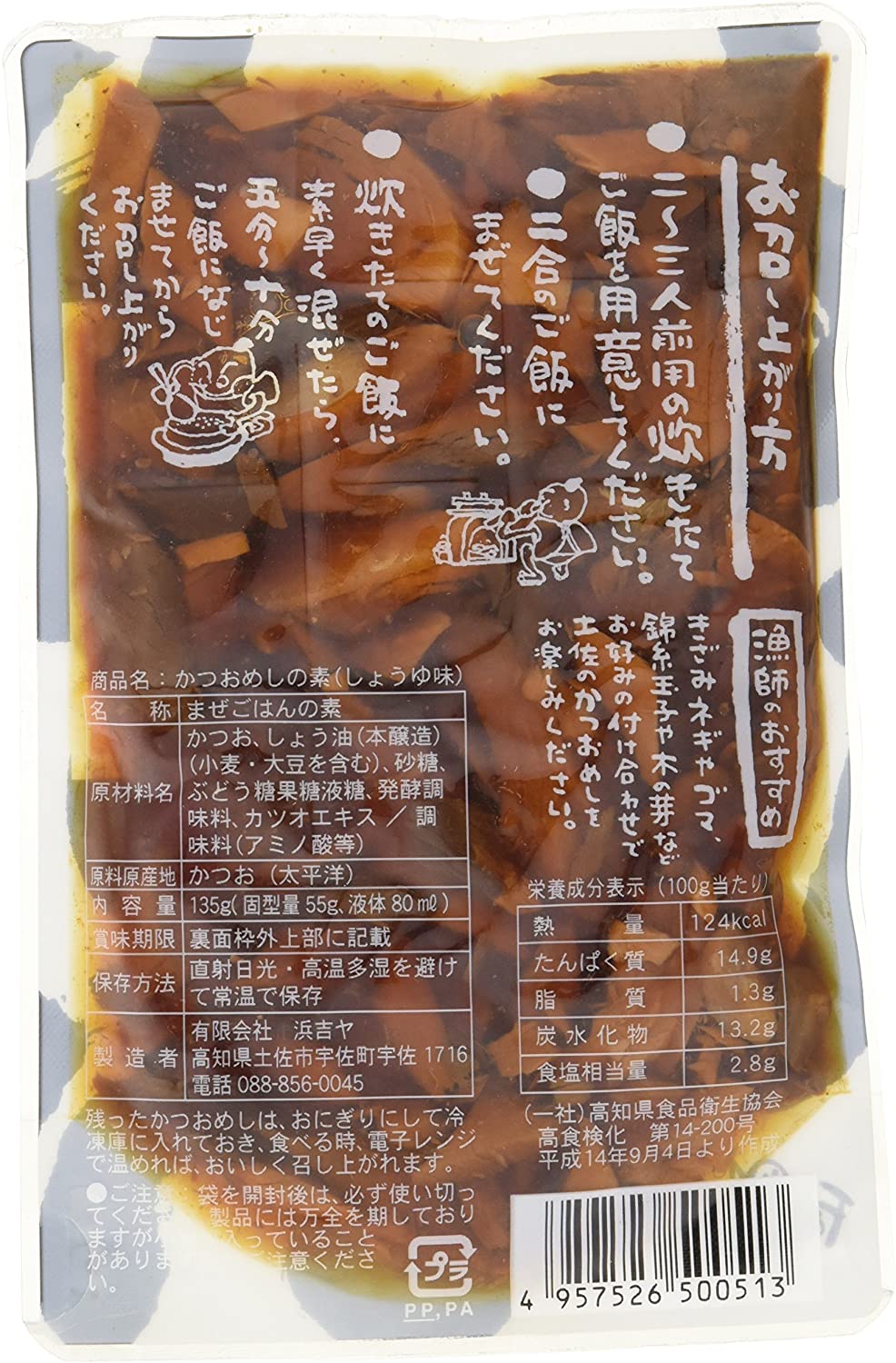 ・原材料:原材料:鰹、しょう油(本醸造)(脱脂加工大豆、小麦、食塩)砂糖(精製糖)、ぶどう糖果糖液糖(でん粉(コーンスターチ)、発酵調味料(糖類、発酵調味料、アルコール、食塩、)カツオエキス、調味料(アミノ酸等)(L-グルタミン酸Na、D-ソルビトール、5´-イノシン酸Na)
