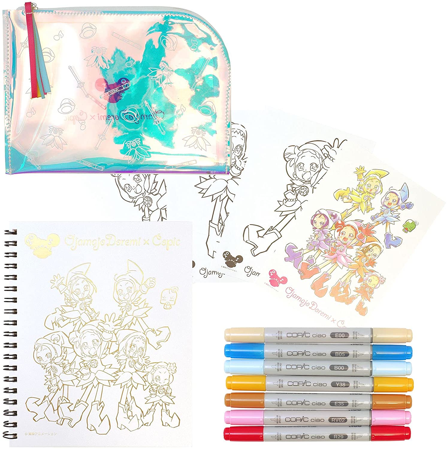 「おジャ魔女どれみ」シリーズ20周年記念に加え、シリーズ。キャラクターコンセプトデザインを務めるアニメーター馬越嘉彦氏がコピックを愛用していることから実現した「おジャ魔女どれみ」とコピックのコラボセット。。。セット内容。・コピックチャオ。7色(R29/RV02/E35/Y38/B00/B05/E00)。・おジャ魔女どれみコピック特製ポーチ(ホワイト)。・おジャ魔女どれみデザイン。特製コピックスケッチブック(ゴールドver)。・コピック塗り方ガイド(どれみ・はづき・あいこver)。