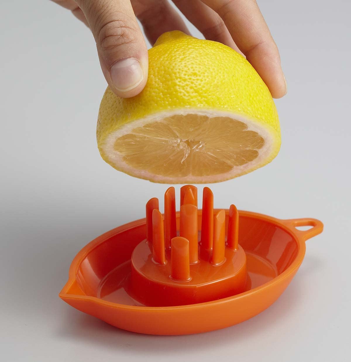 より●100年間変わらなかった、くだもののしぼり器の形状が新しくなった●主婦のアイデアから生まれた、新しい形状でかる~くたっぷり絞れる●剣山型の特殊なしぼり構造により、レモンを回転させながら軽く押しこむだけで、果汁がたっぷり絞れる●山形タイプのしぼり器は力が必要なわりに、なかなか絞りきることができない。剣山型は直接果肉に食い込ませて回すので、果汁がたっぷり絞れる●果汁がたっぷり絞れるので、濃厚でフレッシュ感あふれるドリンクを作ることができる●カラーバリエーションが豊富(5色)で、自分の好きな色を選んだり、キッチンカラーに合わせる事ができる