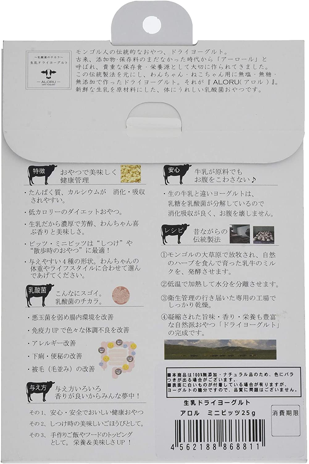 商品紹介モンゴル人の伝統的なおやつ、ドライヨーグルト。古来、添加物・保存料のまだなかった時代から「アーロール」と呼ばれ、貴重な保存食・栄養源として大切に作られてきました。この伝統製法を元にし、わんちゃん・ねこちゃん用に無塩・無糖・無添加で作ったドライヨーグルト。それが『-ALORU-アロル』。新鮮な生乳を原材料にした、ペットの体にうれしい乳酸菌おやつです。原材料・成分オールナチュラル