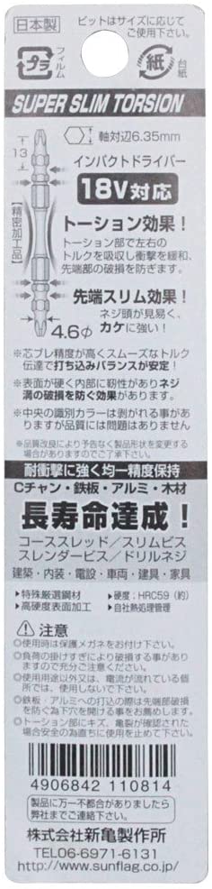先端スリムで長寿命達成。衝撃吸収。ネジ頭が見やすい先細最強型。トーション効果、トーション部で左右のトルクを吸収し衝撃を緩和、先端部の破損を防ぎます。先端スリム効果、ネジ頭が見やすくカケに強い。芯ブレ精度が高く、スムーズなトルクの伝達で打ち込みバランスが安定。表面が硬く内部に靱性がありネジ溝の破損を防ぐ効果があります。コーススレッド、スリムビス、スレンダービス、ドリルネジに。建築、内装、電設、車両、建具、家具に。