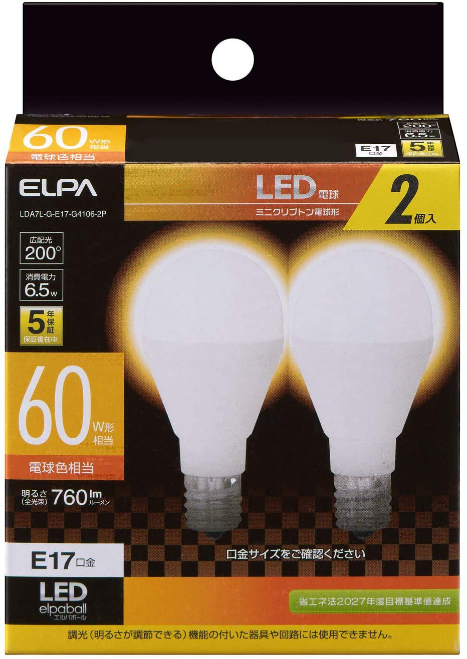 エルパ LED電球 2個セット ミニクリプトン球形 口金E17 40W形 電球色 5年保証 LDA7L-G-E17-G4106-2P