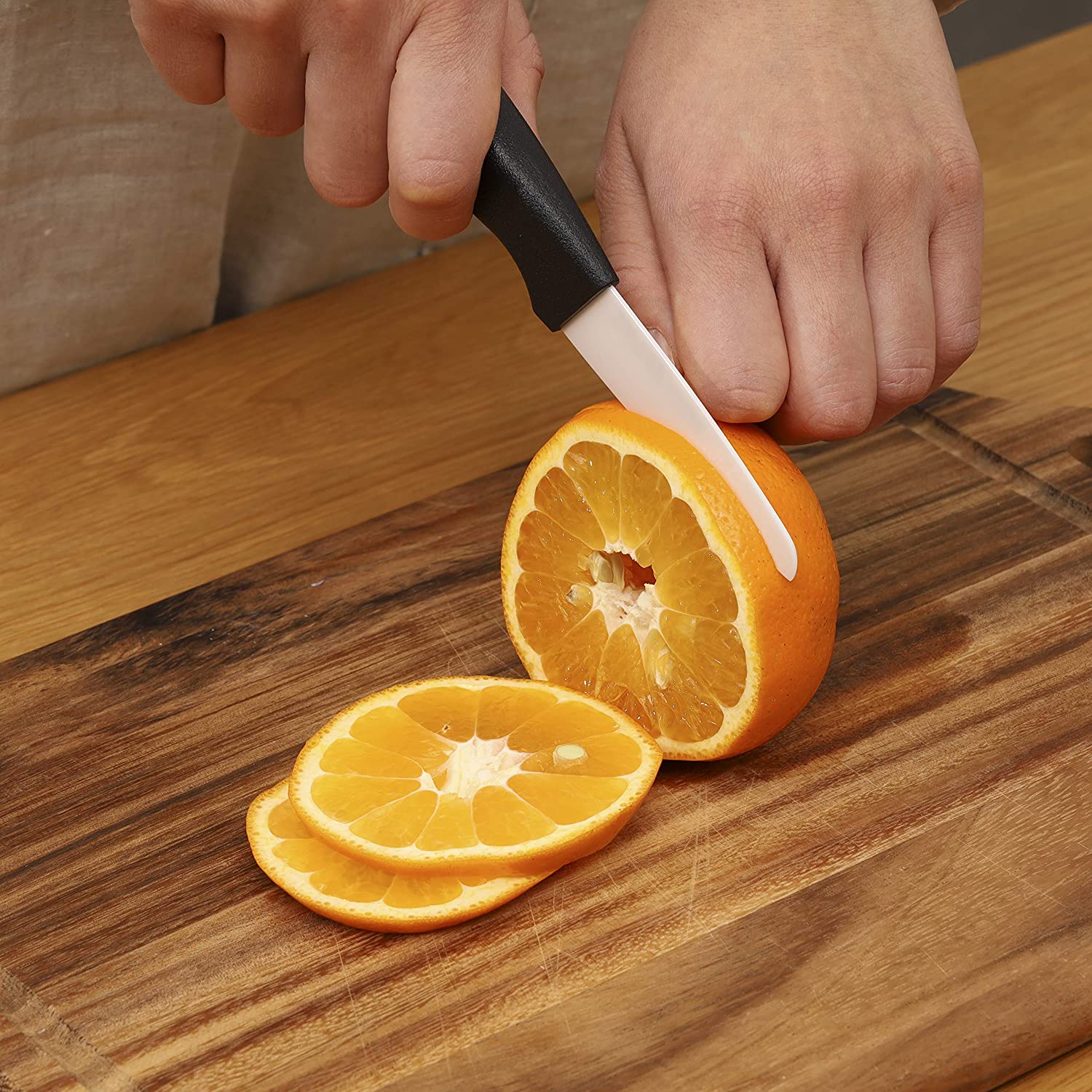 切れ味永持ちのセラミック刃。軽い、錆びない、金属アレルギーもない為安心して使えます。衝撃に弱い為、硬い物は切らないでください。