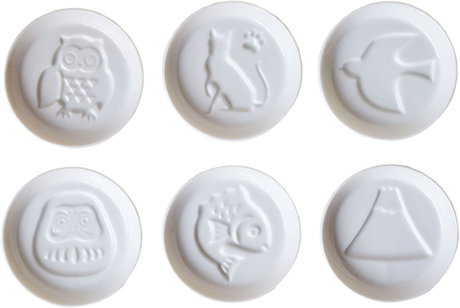 ・サイズ:φ82×H15mm/1ヶ ・材質:磁器 ・生産国:日本製 ・電子レンジ/○、食洗機/○ ・ 【商品詳細】 パターン(種類):富士山・鯛・ダルマ・千鳥・フクロウ・猫(6P)縁起模様や動物がモチーフの醤油皿、醤油を注ぐと絵柄が浮き出る様に凸凹になっております。