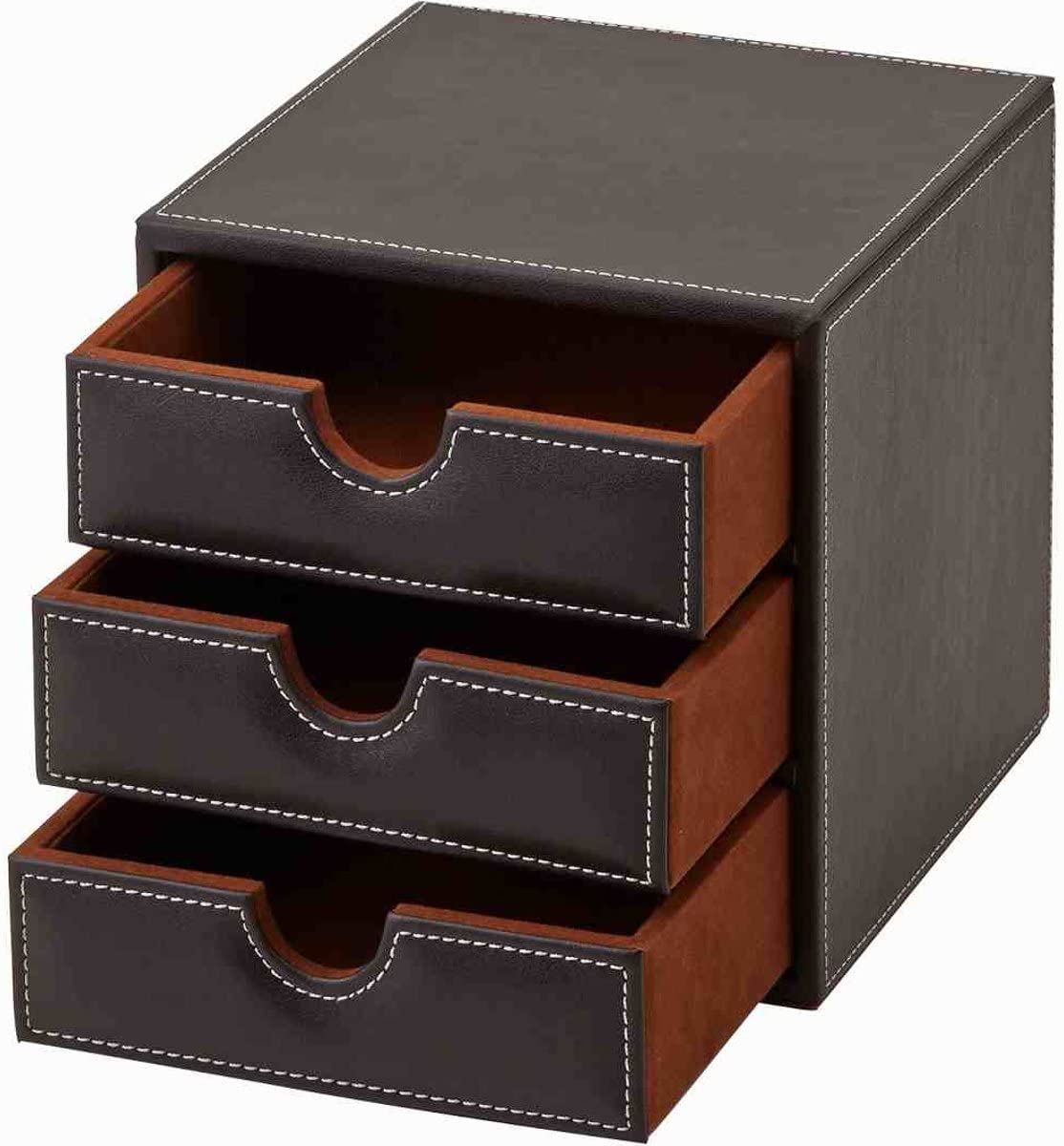 落ち着きのあるダークブラウン、質のよいフェイクレザーにステッチ加工を施したおしゃれ小物収納『BASIC』シリーズ。表面レザーは軟らかく弾力性があり、高級感があります。内側はベロア調で起毛しておりさわり心地もよい。文具品やお薬などの小物を入れる引き出し収納。裏面には隠し扉付きで、秘密のアイテムをしまって置ける。