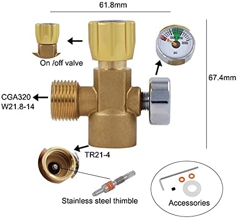 製品名:ブラスASA材質:真ちゅう重量:180グラムスレッド:TR21-4からCGA320、W21.8-14高さ:67.4mm幅:61.8mmゲージ圧:3000psi比色計付属品:ワッシャー1個、小型レンチ1個、ASAロッドラバーリング2個(オレンジ)、ネジ1個(黒)
