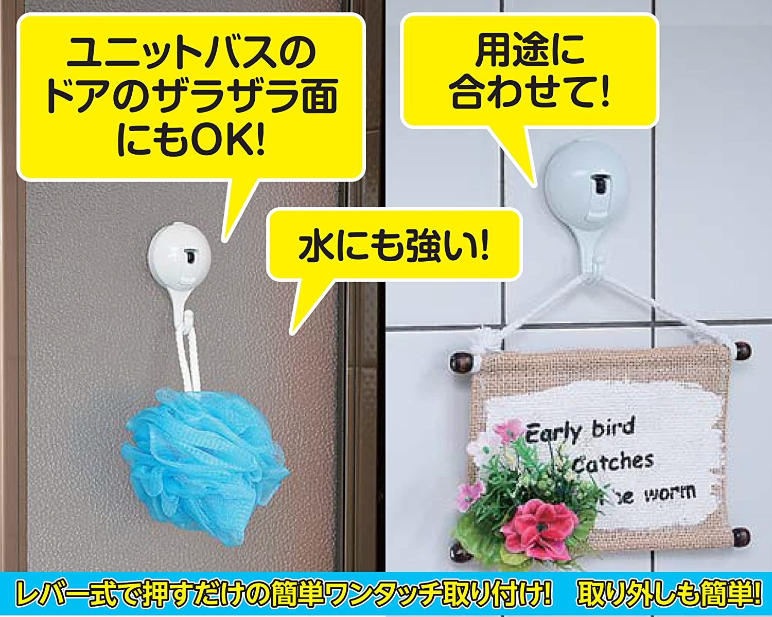ジェルタイプのポリウレタンと合成ゴム(NBR)を使用して、今までの吸盤の限界を超えた新タイプの強力吸盤フックです。凸凹なタイルを屈曲面にも付着可能。いままでの吸盤を付けて落ちていた場所でもお試しください。吸盤の限界を超えた製品です。