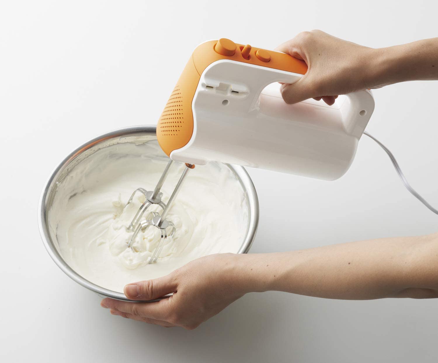 商品紹介家庭専用のハンドミキサーです。ミキサーのスピードを5段階に切替えることができます。材料に合わせてお使いください。使用方法1、材料とボールを用意します。・深めのボールを用意してください。浅いと材料が飛び散ることがあります。・樹脂やアルミ製のボールは傷つきやすいので避けてください。・ピーターの羽根が隠れてしまう程の多量の材料をボールに入れないでください。2、ピーターを差し込んでください。・使用中にピーターが外れないようにカチっと音がするまで差し込んでください。・ピーターは2本一緒にお使いください。3、電源プラグをコンセント(交流100V)に差し込み、スピード切替スイッチを入れます。・スピード切替スイッチが0(OFF)になっているのを確かめてから電源プラグをコンセント(交流100V)に差し込みます。・ピーターをボールの中に入れてからスピード切替スイッチ(1~5)をいれください。4、材料をむらなくかくはんします。・ピーターがボールの底に軽くあたるようにして使います。・使用途中で一時中止するときはスピード切替スイッチを0(OFF)にしてテーブルに置きます。・食材からピーターを引き上げる際はスピード切替スイッチを0(OFF)にしてピーターの回転が止まったことを確認してください。食材が飛び散る原因になります。・用途により、スイッチを切り替えて回転速度を調整してください。・本体を時々を動かしてむらなくかくはんします。5、かくはんが終わりましたらスピード切替スイッチを0(OFF)にして電源プラグをコンセントから外します。6、ピーター取り外しボタン(EJECT)を押してピーターをはずします。・ピーターを手で支えて、スピード切替スイッチを0(OFF)の部分に合わせ、ピーター取り外しボタンをおします。ピーターを落とすと変形しますので大切に扱ってください。7、コードや電源プラグは後部に収納します。・本品から緑の部分を引き出します。・コードを少し余らせて、巻きつけます。・電源プラグを凹部分に押し込みます。・緑の部品をカチッと音がするまで本体に押し込みます。8、洗浄したピーターは側面にとりつけます。・ピータの羽根がハンドルにあたらないように気をつけてください。使用上の注意・水をかけたり、水につけたりしないでください。電源プラグを抜いてからお手入れを行ってください。・必ず、電源プラグを抜いてから、取り外してください。・運転中は手、ヘラ、スプーン等がピーターにふれないようにしてください。・ガスコンロやオーブンなどの近くに置かないでください。・冷蔵後から取り出した直後等の固い材料やパン生地のような粘り強い材料にはハンドミキサーを使わないでください。・本体の水洗いは絶対にしないでください。・調理以外の目的には使わないでください。・使用中は風穴をふさがないでください。・故障(コードの破損も含む)したときは、使用を中止し、販売店かお問い合わせ先に修理を依頼してください。絶対に分解や修理はしないでください。・運転中はピーター取り外しボタンを押さないでください。・定格時間(10分)以上は連続で使わないでください。・かくはんのスピード1の位置から始めて料理にあったスピードに上げてゆきます。この1の位置では30秒以上かくはんしないように注意してください。