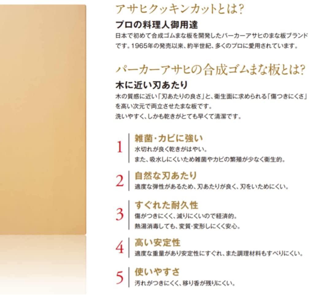 商品紹介商品紹介 多くのプロに愛用されているゴム製まな板に抗菌仕様が登場。 抗菌剤入りで衛生的。雑菌の繁殖を防ぎます。 適度な弾力で刃当たりが良く、包丁も傷めにくい材質です。 水切れが良く速乾性があるので雑菌、カビの増殖が少なく衛生的。 ゴム特有の戻りの良さによって傷に強く長持ちし、熱湯消毒をしても変形しにくく、汚れが目立つ場合は漂白剤も使用可能です。 汚れ、臭いがつきにくくお手入れも簡単。 見た目も木製の様な優しいベージュ色。 ●キズに強く、刃当たりが良く、汚れが落ちやすく、臭いも付きにくいまな板より●レストラン向け業務用商品