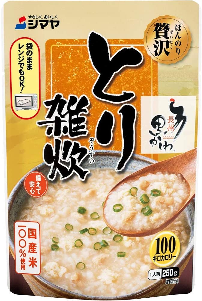 商品紹介山口県産 地どり「長州黒かしわ」の身を使用し、むね肉とがらスープでごはんをやわらかく炊き上げた、味わい深い雑炊です。国内産のお米を使用しています。温めてもそのままでも、1人分からお手軽にお楽しみいただけます。袋のまま電子レンジで温めてお召し上がりいただけるレンジアップ商品です。一食分250g入りで、100kcalです。原材料・成分米(国内産)、鶏卵、鶏肉、鶏がらスープ、でん粉、チキンエキス、野菜エキス、食塩、たん白加水分解物、しいたけエキス粉末、こんぶ粉末、調味料(アミノ酸等)、(原材料の一部に小麦、大豆、豚肉、ゼラチンを含む)