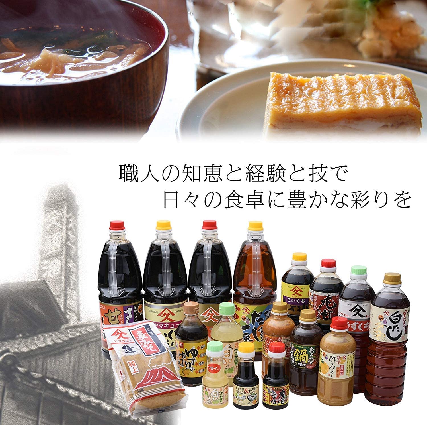 ・原材料:アミノ酸液、脱脂加工大豆、小麦、食塩、ぶどう糖果糖液糖、調味料(アミノ酸等)、カラメル色素、甘味料(甘草、ステビア、サッカリンNa)、ビタミンB1