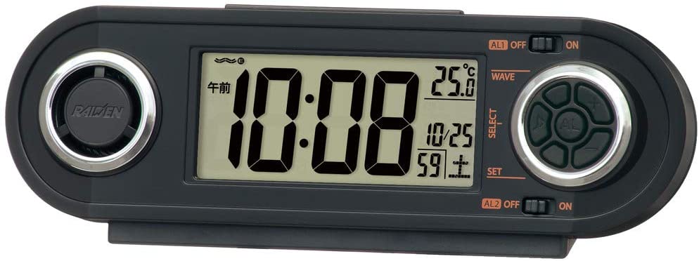 カラー:01:黒?|?パターン(種類):01:リニューアルモデル圧倒的大音量アラーム「ライデン」シリーズ。コンパクトサイズに30種のアラーム音を搭載。◆RAIDEN ライデン大きなアラーム音が特徴の目ざまし時計シリーズです。◆選べる30種のアラーム音01 EDM02 ドラムス03 レトロゲーム04 シューティング05 レベルアップ06 カキーン07 バトル08 モンスター09 ドーン10 ファンタジー11 鐘12 サスペンス13 マジック14 サイレン15 バイク16 電気17 足音18 ロボット19 バブル20 ギター21 ガラス22 サンバ23 朝ごはん24 カウントダウン25 タイピング26 ドラムンベース27 コケコッコー28 バイブ音29 電子音30 ベル音◆標準電波クロック正確な時刻情報をのせた電波を受信し、自動的に表示時刻を修正するクロックです。ご使用の際は、できるだけ電波を受けやすい窓際などに置き、電波ノイズの発生する場所は避けてください。●電波を受信していないときは、クオーツの精度で作動します。●また以下のような場所では正確に受信できない場合がありますので、あらかじめご了承ください。・ビルの中、ビルの谷間、地下。・高圧線、テレビ塔、電車の架線の近く。・テレビ、冷蔵庫、エアコン、空気清浄機、パソコン、ファクシミリ等の家電製品やOA機器の近く。・工事現場、空港の近くや交通量の多い所など、電波障害の起きる所。・乗り物の中。(自動車、電車、飛行機など。)・その他電波ノイズを発生させるものの近く。・スチール机等の金属製の家具の上や近く。※受信可能地域以外でも条件によっては受信可能な場合があります。