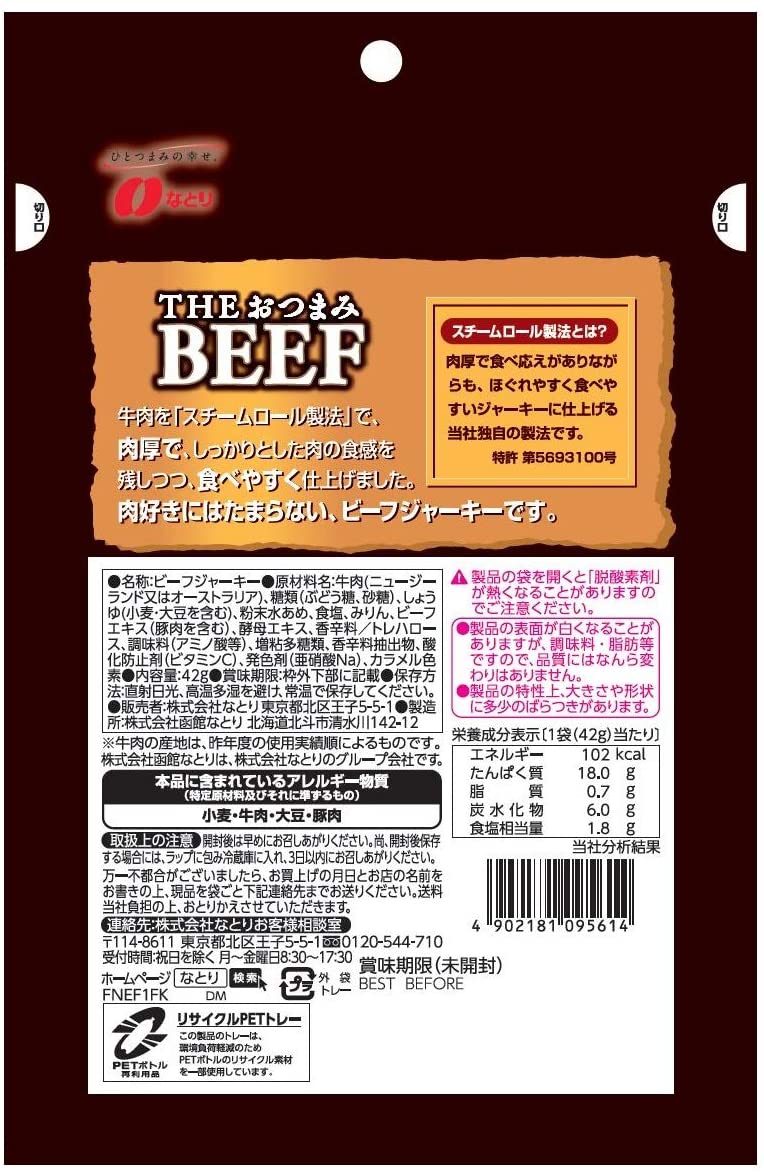 肉厚なのに食べやすい! 牛肉を「スチームロール製法」で肉厚で、しっかりとした肉の食感を残しつつ、食べやすく仕上げました。肉好きにはたまらない、ビーフジャーキーです。スチームロール製法とは、肉厚で食べ応えがありながらも、ほぐれやすく食べやすいジャーキーに仕上げる当社独自の製法です。(特許 第5693100号)1袋(42g)あたり:エネルギー 102kcal、たんぱく質 18.0g 、脂質 0.7g、、 炭水化物 6.0g、食塩相当量 1.8g