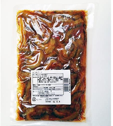 ・原材料:ゴーヤ、かつお節、漬け原材料(しょうゆ、糖類(果糖ぶどう糖液糖、果糖)、食塩、鰹節エキス、蛋白加水分解物、醸造酢、唐辛子)、調味料(アミノ酸等)、酒精、着色料(クチナシ色素、アナトー色素)(原材料の一部に小麦、大豆を含む)