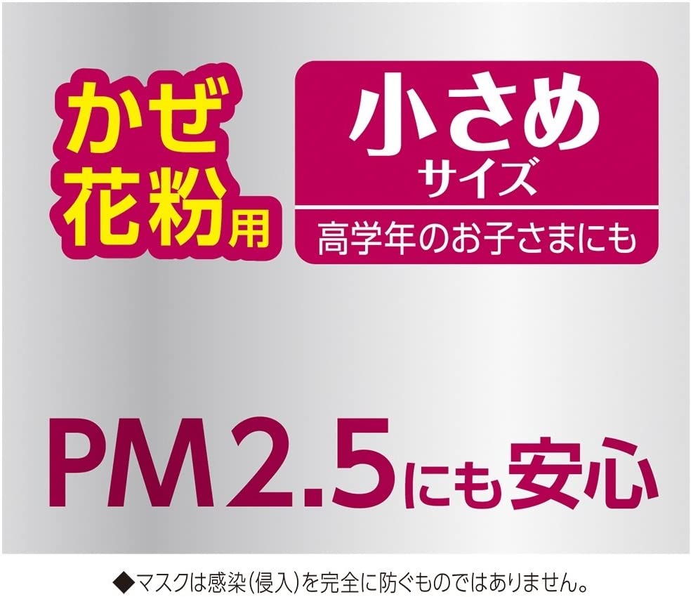 サイズ:小さめサイズ●三層構造フィルタと全面フィット構造でスキマを作らず、強力遮断●三層構造の高密度フィルタでウイルス飛沫・花粉をブロック●ノーズフィット搭載の超立体構造でぴったりフィット●なめらかフィルタでつけ心地快適●やわらかストレッチ耳かけで繰り返しつけ外ししてもフィットが持続●息ラクフィルタと口元空間で息ラクラク●高い保湿効果でのどをうるおす