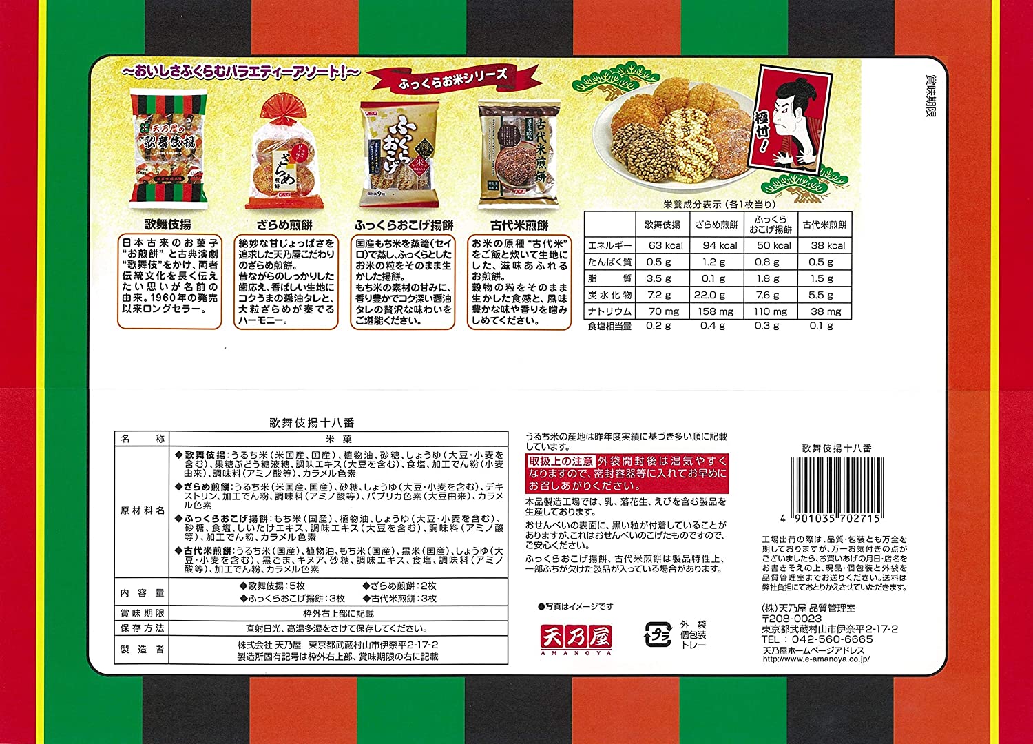 ・原材料:◆歌舞伎揚:うるち米(米国産、国産)、植物油、砂糖、しょうゆ(大豆・小麦を含む)、果糖ぶどう糖液糖、調味エキス(大豆を含む)、食塩、加工でん粉(小麦由来)、調味料(アミノ酸等)、カラメル色素◆ざらめ煎餅:うるち米(米国産、国産)、砂糖、しょうゆ(大豆・小麦を含む)、デキストリン、加工でん粉、調味料(アミノ酸等)、パプリカ色素(大豆由来)、カラメル色素◆ふっくらおこげ揚餅:もち米(国産)、植物油、しょうゆ(大豆・小麦を含む)、砂糖、食塩、調味エキス(大豆を含む)、調味料(アミノ酸等)、加工でん粉、香辛料抽出物(大豆由来)、カラメル色素、パプリカ色素(大豆由来)◆古代米煎餅:うるち米(国産)、植物油、もち米(国産)、黒米(国産)、しょうゆ(大豆・小麦を含む)、黒ごま、キヌア、砂糖、調味エキス、食塩、調味料(アミノ酸等)、加工でん粉、カラメル色素