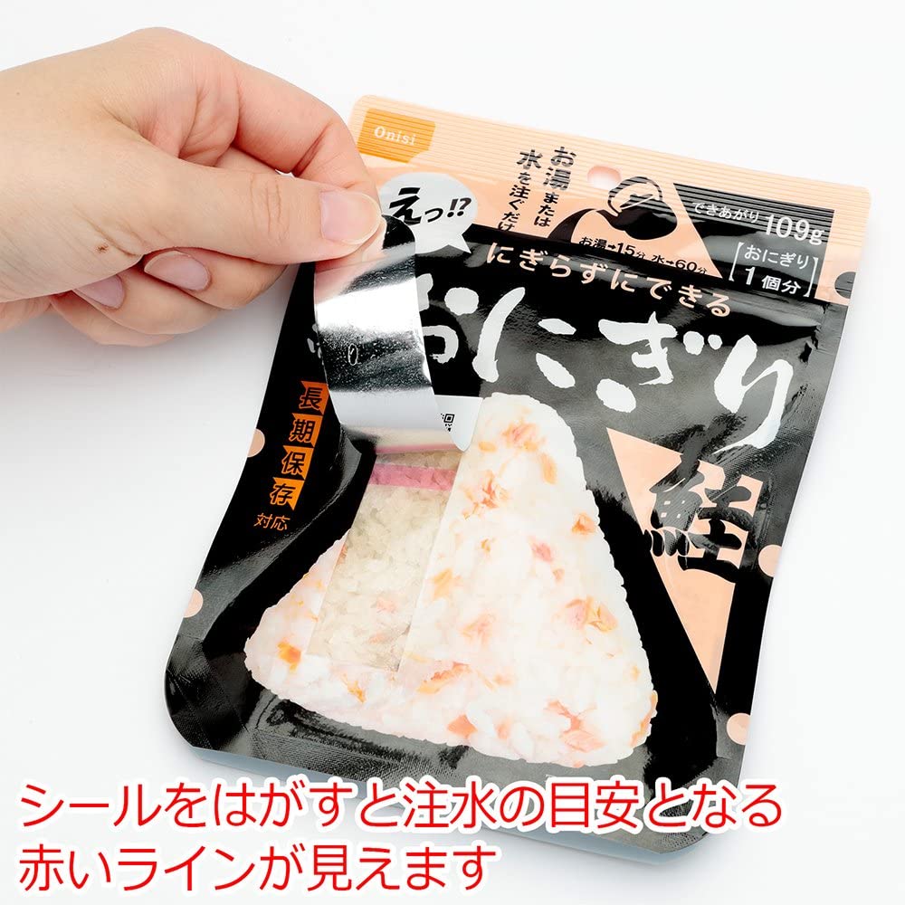 ・[商品詳細] ●保存期間:5年 ●注水量:約59ml ●水で60分 お湯で15分 ●カロリー:168kcal(1袋) ●手を汚さずに食べられる3点カット方式 ●お湯・水を入れるだけでできる、にぎらない携帯おにぎり