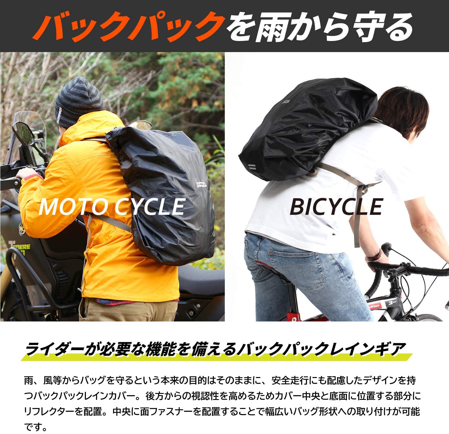 雨、風等からバッグを守るという本来の目的はそのままに、安全走行にも配慮したデザインのバックパックレインカバー 後方からの視認性を高めるためカバー中央と底面に位置する部分にリフレクターを配置。 自転車走行時、前方姿勢になってもリフレクターが見えるよう配慮しています。 なお中央にベルクロテープを配置することで幅広いバッグ形状に取り付けが可能。 素材はテントやアウトドアチェアにも使用される防水性、耐久性に優れた耐水圧3000mmのポリエステル(裏面コーティング)生地を採用。 破れや摩擦に強く、折りたたみ時はコンパクト。重量約140gの軽量設計です。