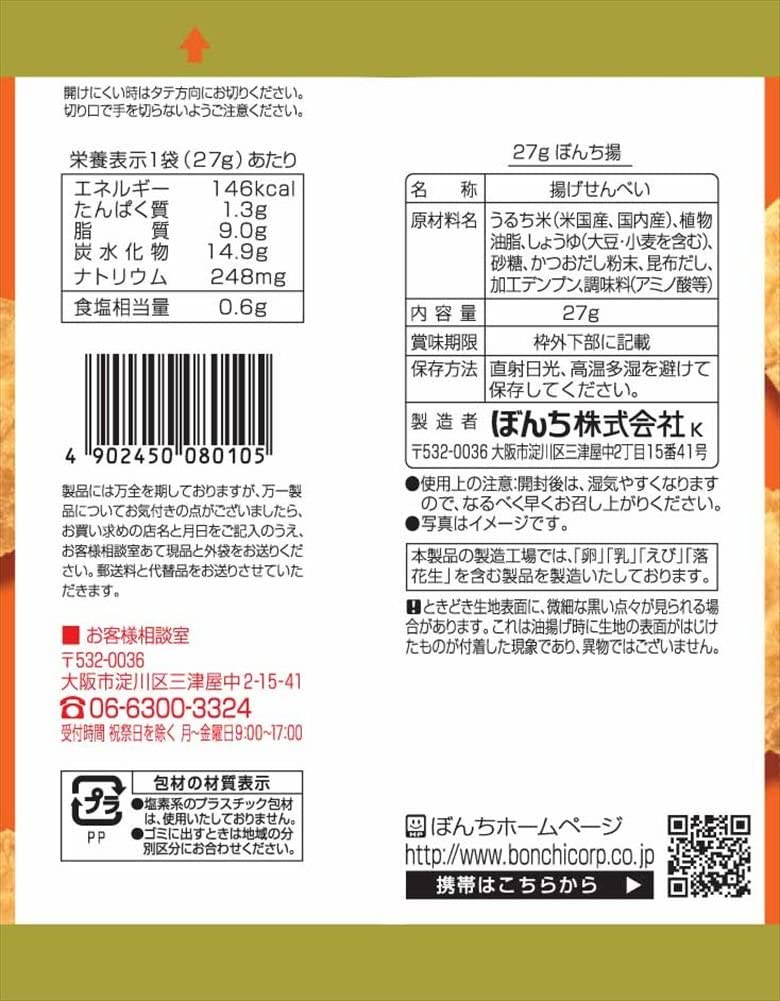 商品紹介うすくち醤油にて味付けした一口サイズの揚げせんべいです。栄養成分エネルギー:146kcal、たんぱく質:1.3g、脂質:9.0g、炭水化物:14.9g、ナトリウム:248mg、食塩相当分量:0.6g原材料・成分うるち米(国内産),植物油脂、しょうゆ(大豆・小麦を含む)、砂糖、かつおだし粉末、昆布だし、加工デンプン、調味料(アミノ酸等)ご注意(免責)>必ずお読みください開封後は、湿気やすくなりますので、なるべく早くお召し上がりください。写真はイメージです。本製品の製造工場では、「卵」「乳」「えび」「落花生」を含む製品を製造いたしております。 ときどき生地表面に、微細な黒い点々が見られる場合があります。これは油揚げ時に生地の表面がはじけたものが付着した現象であり、異物ではございません。開けにくい時はタテ方向にお切りください。切り口で手を切らないようにご注意ください。続きを見る