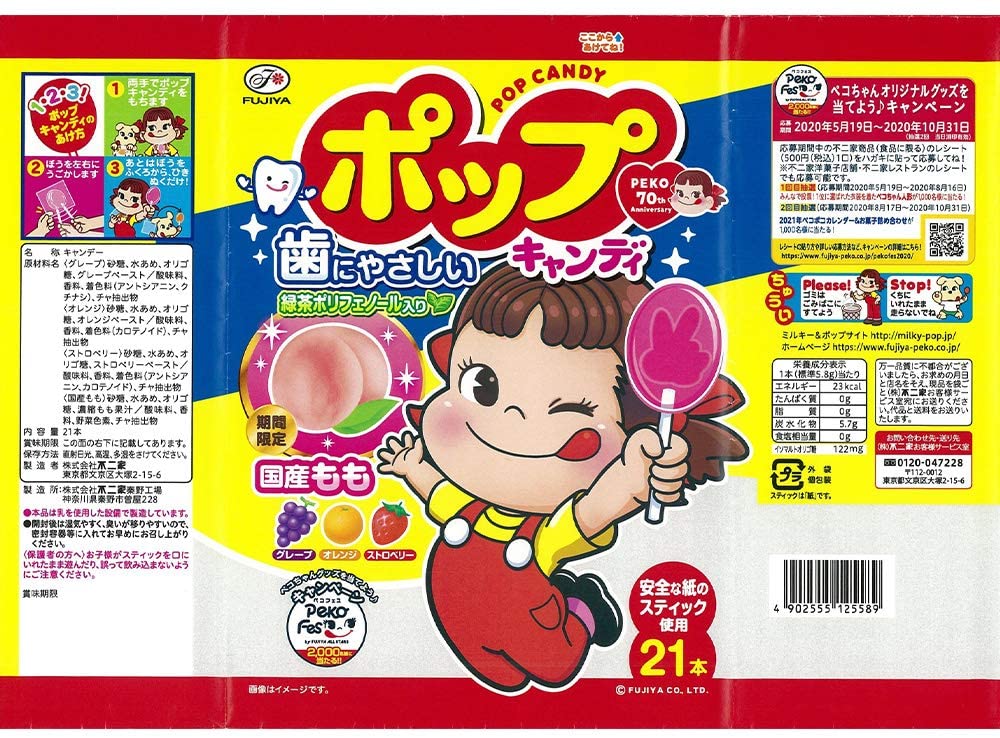 ・パッケージデザインは2種類でペコちゃんが2通りのポーズをしているので、お子様に選んで楽しみながら手に取ってもらえるデザインです。歯に優しい成分の緑茶ポリフェノールを配合し、お子様に安心して買ってあげられる、特別感のある棒付きキャンディのアソートです。キャンディの味は、グレープ、オレンジ、ストロベリーに、期間限定のもも味です。