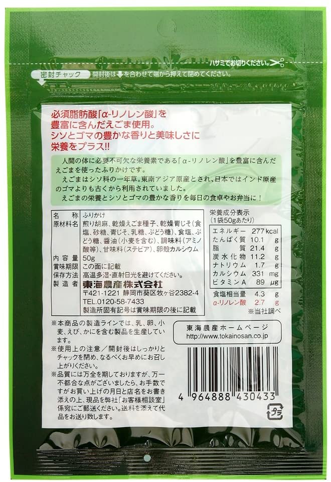 ・原材料:煎り胡麻、乾燥えごま種子、乾燥青じそ(食塩、砂糖、青じそ、乳糖、ぶどう糖)、食塩、ぶどう糖、醤油(小麦を含む)、調味料(アミノ酸等)、甘味料(ステビア)、卵殻カルシウム