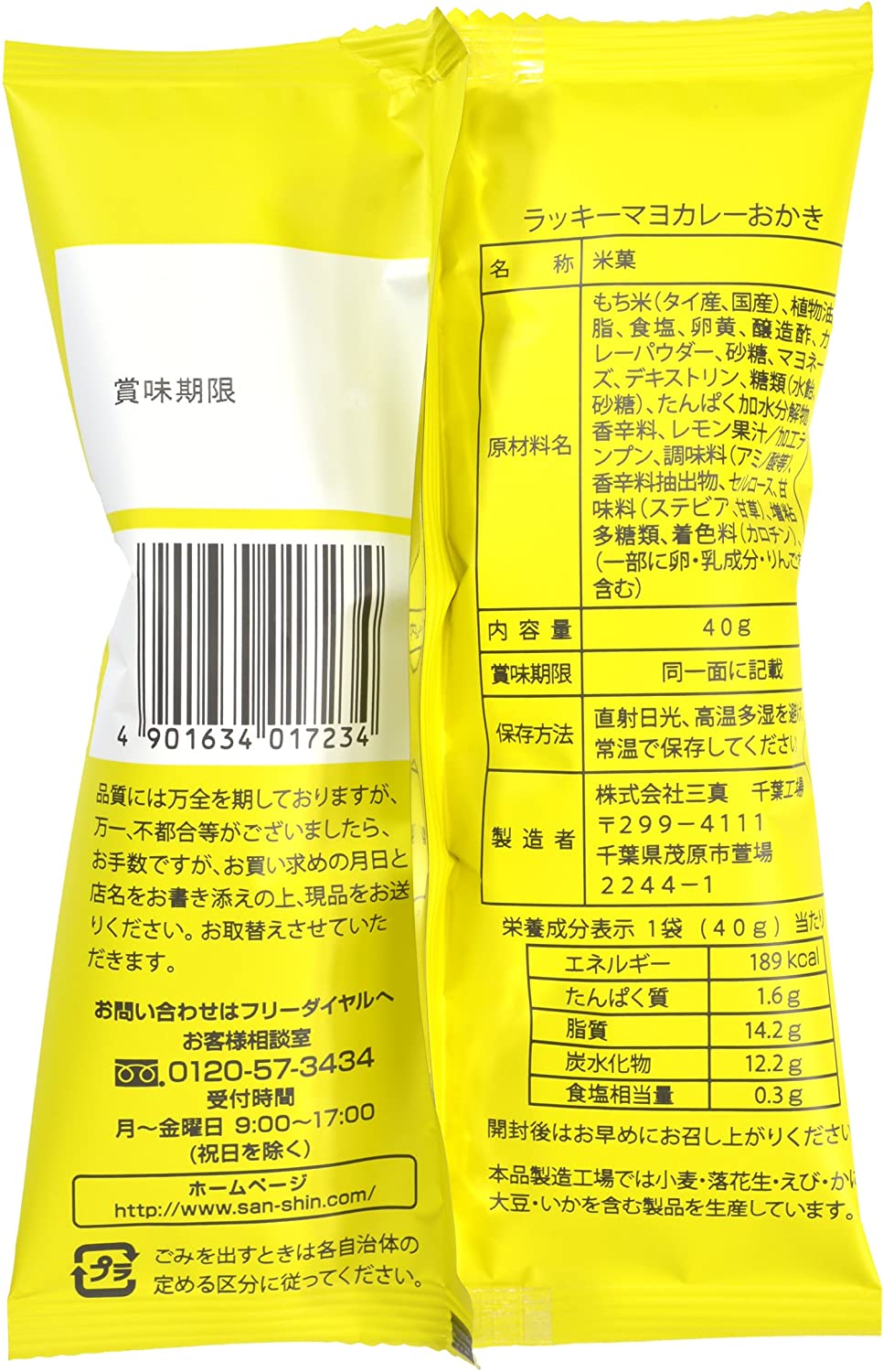 ・原材料:もち米(タイ産、国産)、植物油脂、食塩、卵黄、醸造酢、カレーパウダー、砂糖、マヨネーズ、デキストリン、糖類(水飴、砂糖)、たんぱく加水分解物、香辛料、レモン果汁/加工デンプン、調味料(アミノ酸等)、香辛料抽出物、セルロース、甘味料(ステビア、甘草)、増粘多糖類、着色料(カロチン)、(一部に卵・乳成分・りんごを含む)