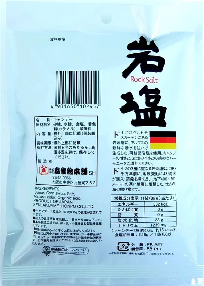 ドイツベルヒテスガーデンの再結晶岩塩を使用した甘辛のハーモニーが楽しめるおいしい塩飴栄養成分(1製品86g当たり)エネルギー332Kcal、たんぱく質0g、脂質0g、炭水化物783g、ナトリウム1239mg