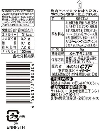 ・原材料:梅、糖類(砂糖、果糖)、でん粉、還元水飴、ハチミツ、食塩、ゼラチン、梅酢、醸造酢、水飴、植物油、食物せんい、トレハロース、加工でん粉、ソルビトール、酸味料、調味料(アミノ酸等)、甘味料(アスパルテーム・L-フェニルアラニン化合物、アセスルファムK)、シソ色素、香料