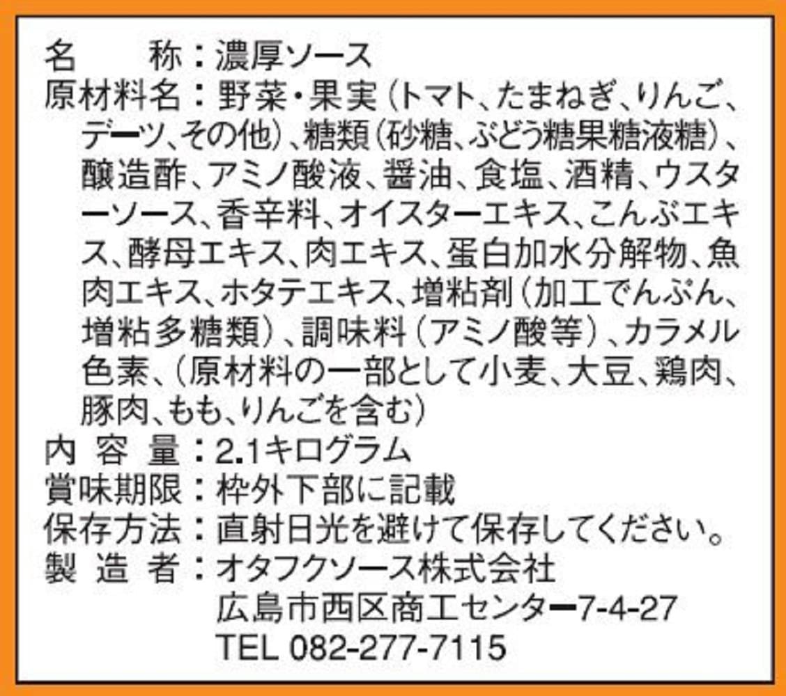 パターン名(種類):2.1kg商品紹介野菜・果実をたっぷり使用し、ちょっぴり効かせた甘さが、たこ焼にうまくマッチします。たこ焼のためのソースです。お好みソースよりも色を濃くし、たこ焼に塗ったときに見栄えのよさにもこだわっています。 1200gでたこ焼40-50人分、2.1kgなら70-80人分です原材料・成分野菜・果実(トマト、たまねぎ、りんご、デーツ、その他)、糖類(砂糖、ぶどう糖果糖液糖)、醸造酢、アミノ酸液、食塩、でんぷん、酒精、醤油(本醸造)、ウスターソース、香辛料、オイスターエキス、マッシュルーム、酵母エキス肉エキス、昆布、ホタテエキス、しいたけ、魚肉エキス、蛋白質加水分解物、調味料(アミノ酸等)、カラメル色素、増粘多糖類(原材料の一部として小麦、大豆、鶏肉、豚肉、もも、りんごを含む)ご注意(免責)>必ずお読みくださいこの商品は、新品をお届けします。 資源節約と販売価格の低下のために、梱包材を再利用しております。 ご理解とご協力をお願いいたします。続きを見る