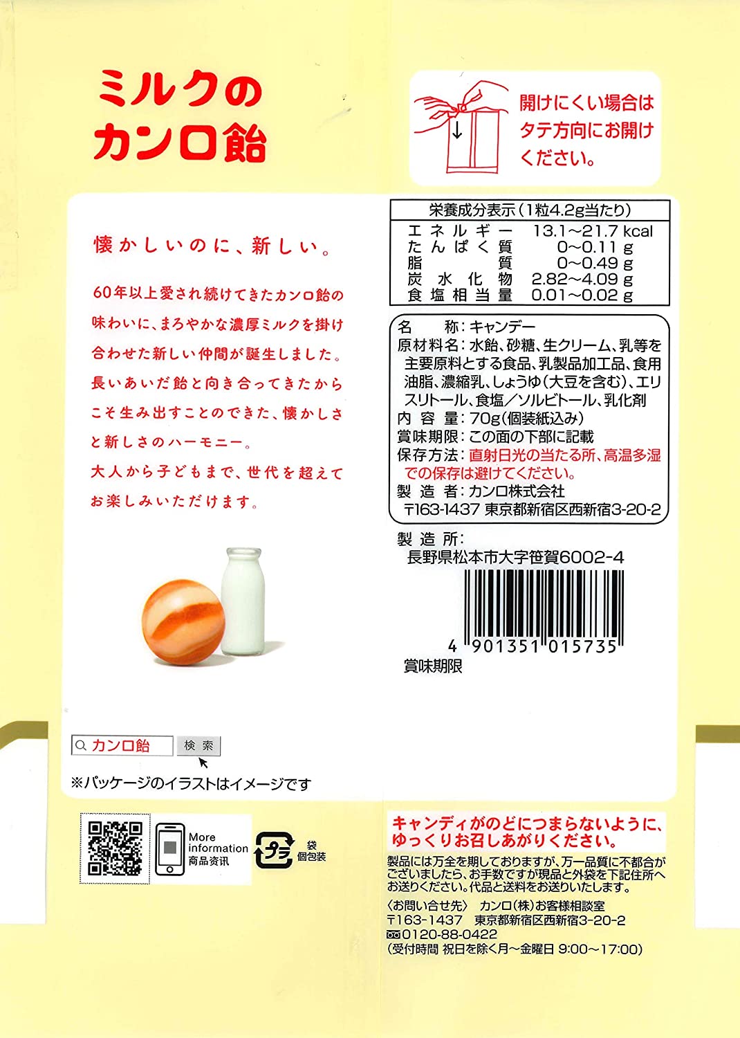 商品紹介・「金のミルク」のミルク飴の技術とロングセラー「カンロ飴」の味わいが融合。まろやかなミルクとカンロ飴の味わいが合わさることで、1粒食べれば幸せを感じる癒しの飴 ・香料、着色料不使用 ・「金のミルク」のミルク飴の技術とロングセラー「カンロ飴」の味わいが融合 ・飴は2つの味わいと見ためが特徴的なマーブル製法 ・カンロ飴を使用した、どこかほっと癒される味わい ・大人から子供まで食べやすい、まろやかなミルクの味わい原材料・成分水飴、砂糖、生クリーム、乳等を主要原料とする食品、乳製品加工品、食用油脂、濃縮乳、しょうゆ(大豆を含む)、エリスリトール、食塩/ソルビトール、乳化剤