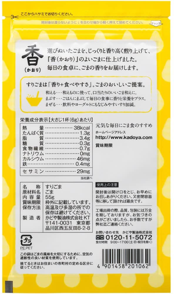 選び抜いた白ごまを、じっくりと香り高く煎り上げて、「香(かおり)」の良いいりごまを仕上げ、丁寧に擂りごまにしました。食物繊維やカルシウム、鉄分、セサミンなどの栄養素を含んでいます。セサミンは活性酸素を撃退する抗酸化物質。特に肝臓で力を発揮し、機能改善が期待できます。