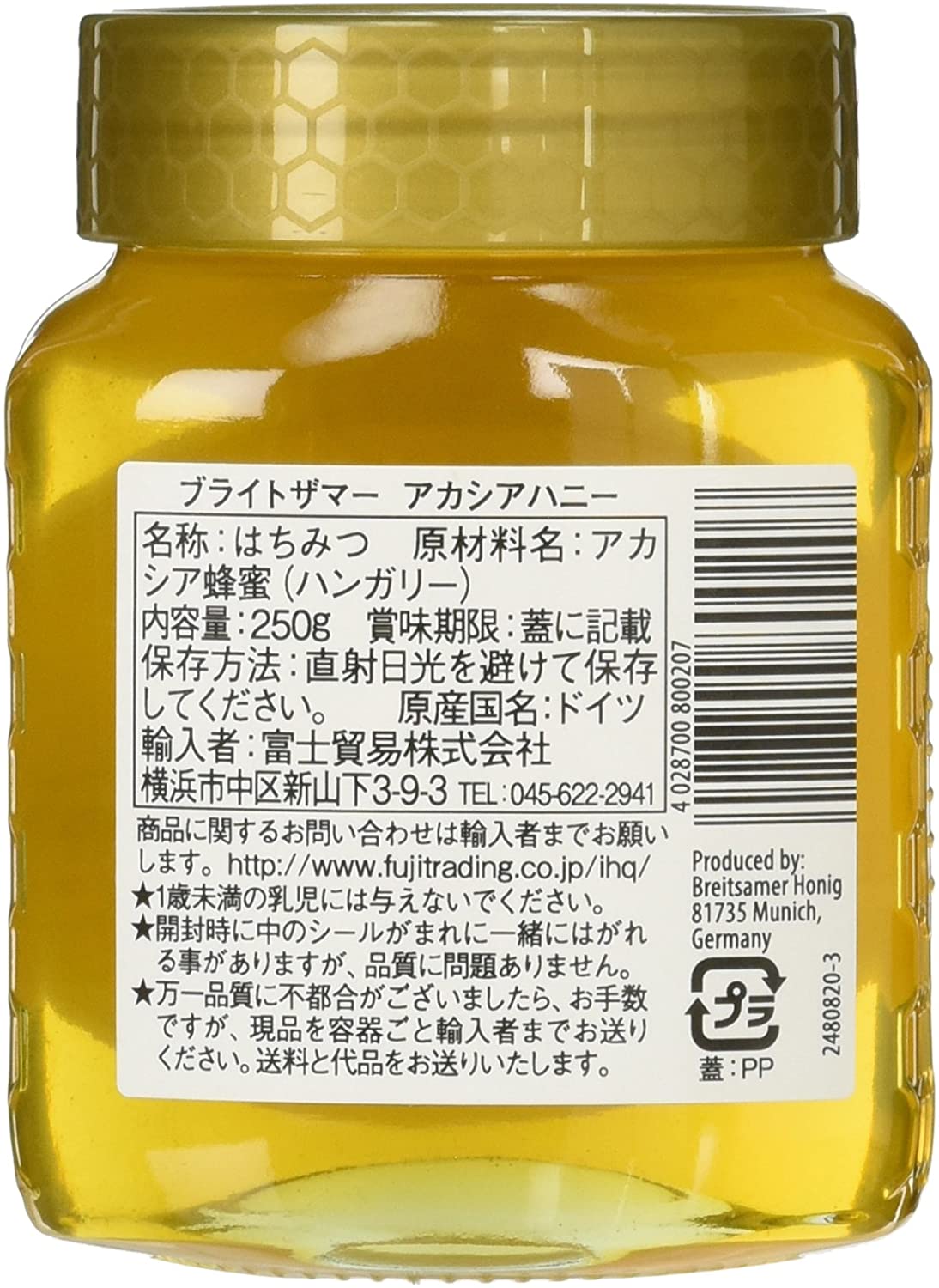 ブライトザマー社は、ドイツ国内第2位、ヨーロッパ第3位の規模を誇る1935年創業の家族経営のハチミツ製造会社です。ハチミツ販売店としてミュンヘンで誕生して以来、3世代に亘りその品質と伝統を守り続け、世界へ販売を拡大し続けています。 一つ一つの契約養蜂家を定期的に訪問し、その品質維持に努め、常に消費者目線で商品を開発・提供しています。アカシアハニーをお薦めする理由はその食べやすさにあります。味わいにクセもなく、香りも柔らかいものです。 ハチミツは種類がありすぎてどれを選べば良いか分からない・・・という方にはやはりアカシアハニーが一番お薦めなのです。 中国産ハチミツ不使用!