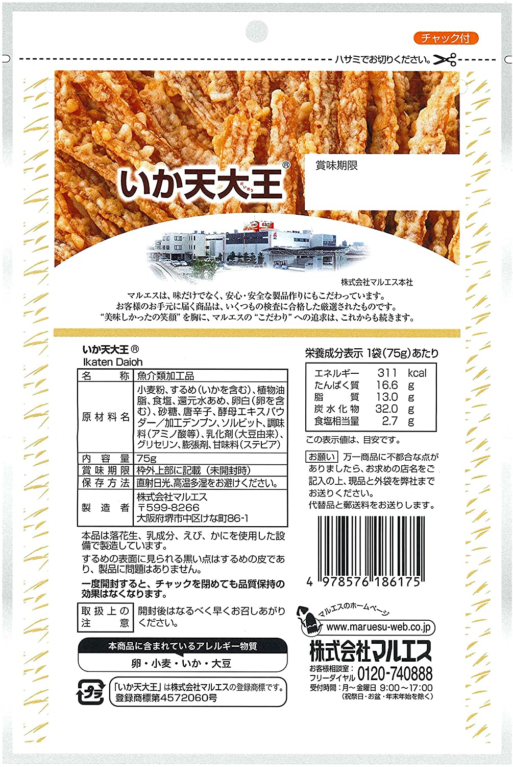 ・原材料:小麦粉、するめ(いかを含む)、植物油脂、食塩、還元水あめ、卵白(卵を含む)、砂糖、唐辛子、酵母エキスパウダー/加工デンプン、ソルビット、調味料(アミノ酸等)、乳化剤(大豆由来)、グリセリン、膨張剤、甘味料(ステビア)