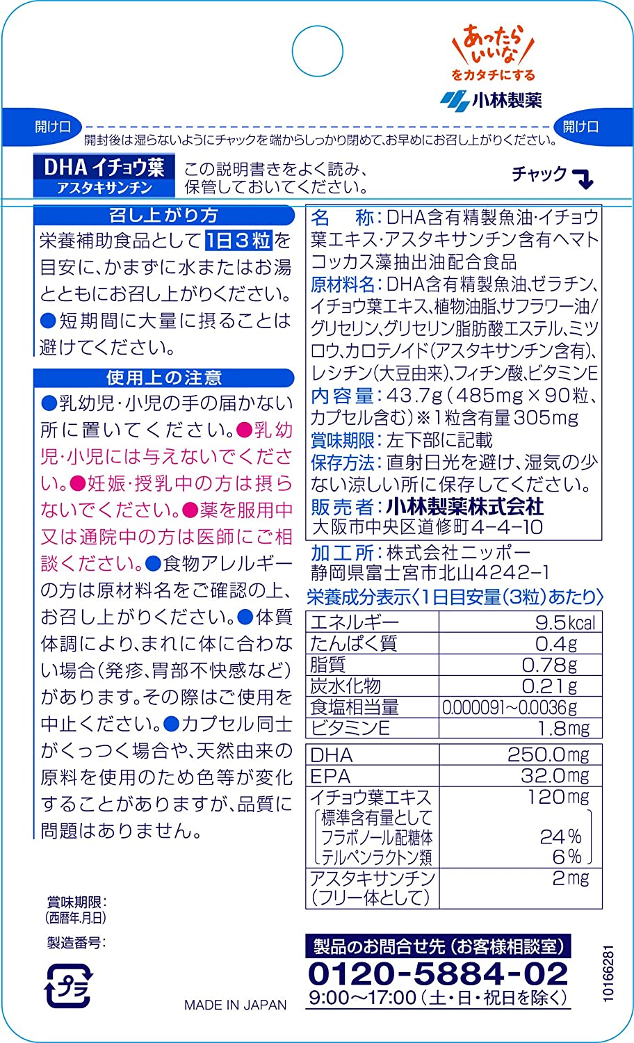小林製薬の栄養補助食品 DHA イチョウ葉 アスタキサンチン 約30日分 90粒