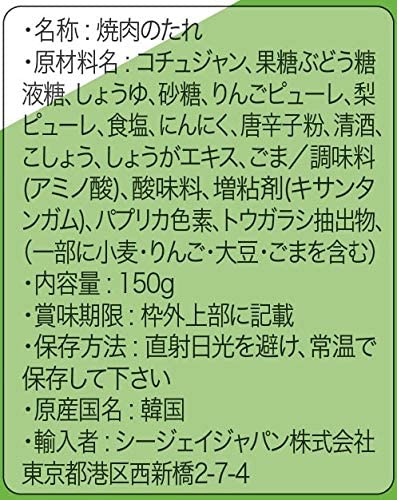 ・原材料:コチジャン、果糖ぶどう糖液糖、しょうゆ、砂糖、リンゴピューレ、、梨ピューレ、食塩、にんにく、唐辛子粉、清酒、L-グルタミン酸ナトリウム、こしょう、しょうがエキス、クエン酸、キサンタンガム、ごま、パプリカ色素、トウガラシ抽出物
