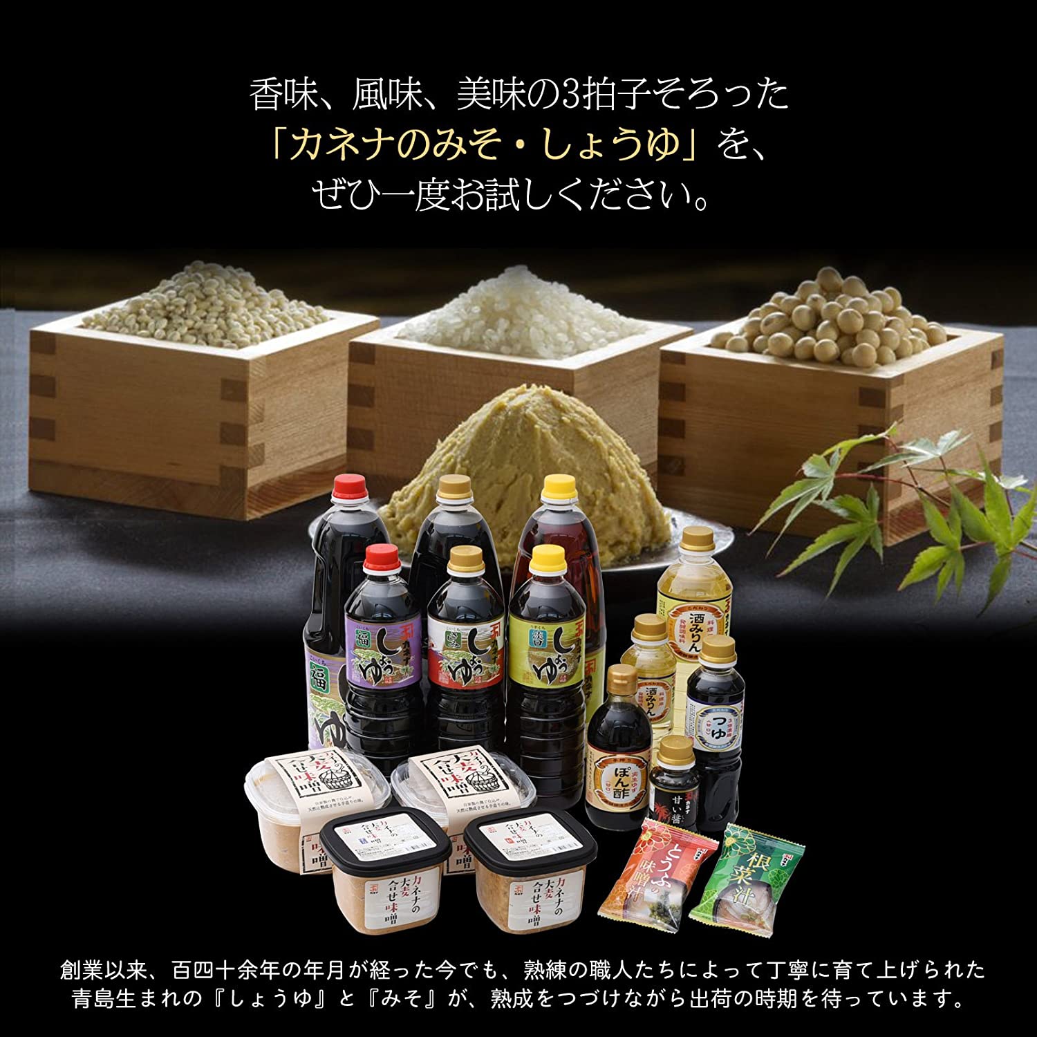万能タイプのこいくちしょうゆ。煮付けなどの味付けにはこれ1本で充分。お台所の隠し味にも最適。南九州の食文化である 『甘口しょうゆ』 と 『麦みそ』。長友味噌醤油醸造元 (カネナしょうゆ) では、南国宮崎・青島の地で南九州の台所には欠かせない『甘口しょうゆ』 と 『麦みそ』 を造り続けています。創業以来、百四十余年の年月が経った今でも、熟練の職人たちによって丁寧に育て上げられた青島生まれの 『しょうゆ』 と 『みそ』 が、熟成をつづけながら出荷の時期を待っています。自然の風土に培われ、創業以来守り続けた酵母菌しょうゆ・みそ造りに最適な厳選された原料、伝統ある熟練した職人技による仕込み、温暖な気候によりじっくりと時間をかけた天然熟成、昔ながらの製法と蓄積された経験、香味、風味、美味の3拍子そろった『カネナのみそ・しょうゆ』 を、ぜひ一度お試しください。