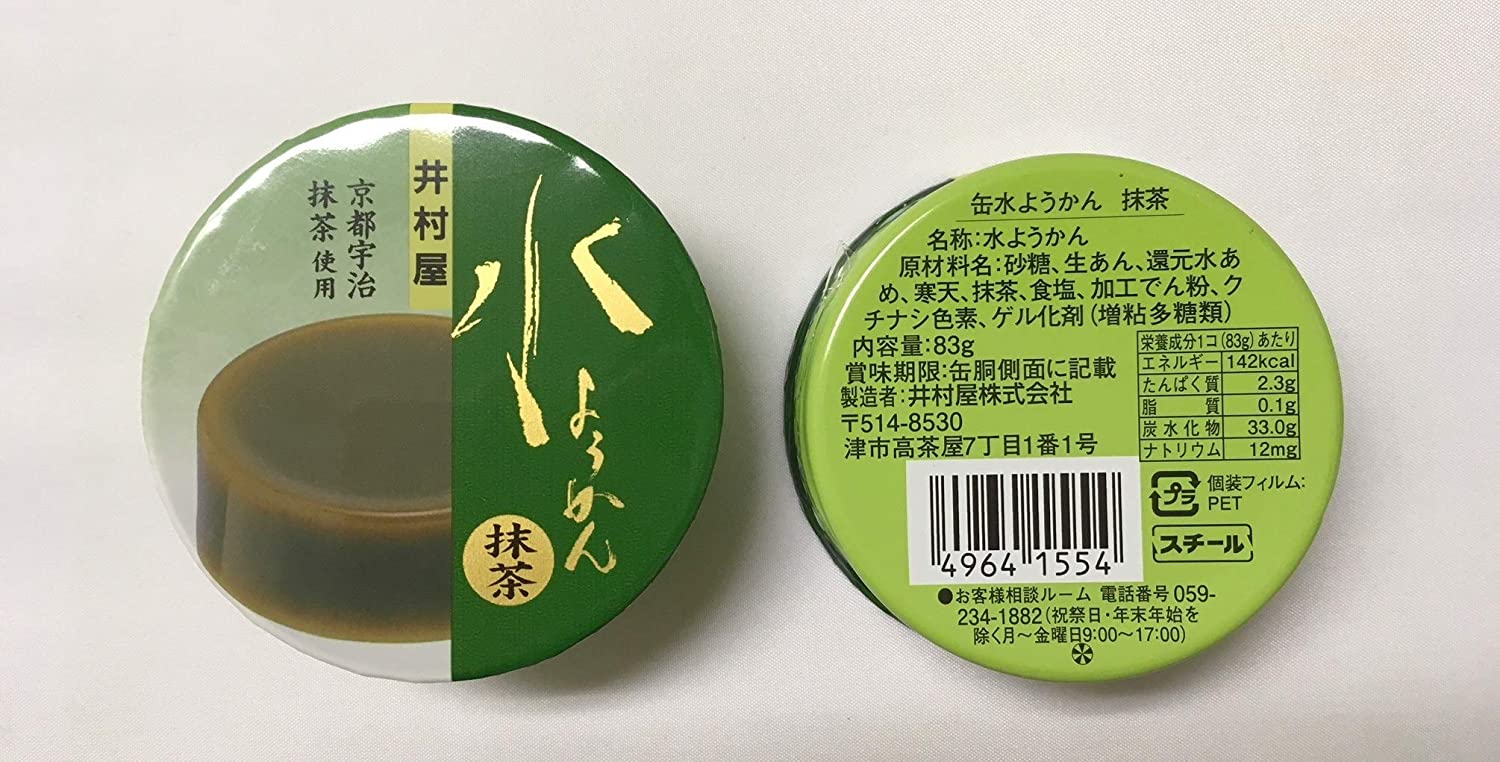 商品紹介缶水ようかん【抹茶】宇治抹茶を使用した昔ながらの食感の水ようかんです。抹茶の風味を最大限に引き出した水ようかんです。栄養成分【1コあたり】エネルギー142kcal、たんぱく質 2.3g、脂質 0.1g、炭水化物 33.0g、ナトリウム 12mg、賞味期限2ヵ年。原材料・成分砂糖、生あん、還元水あめ、寒天、抹茶、食塩、加工でん粉、クチナシ色素、ゲル化剤(増粘多糖類)